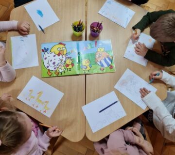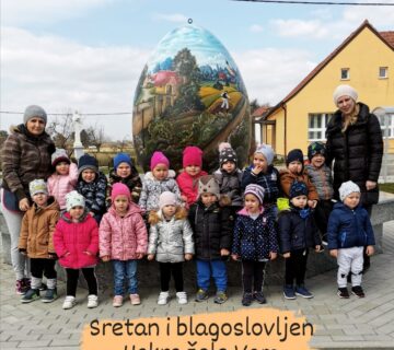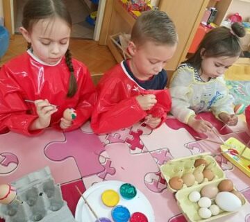Dolazi već Uskrs, zapjevajmo svi. Zečiću košaricu, pripremimo mi. U grmlju će sakriti jaja pun koš,                                                            A lijepih će darova Saznaj više