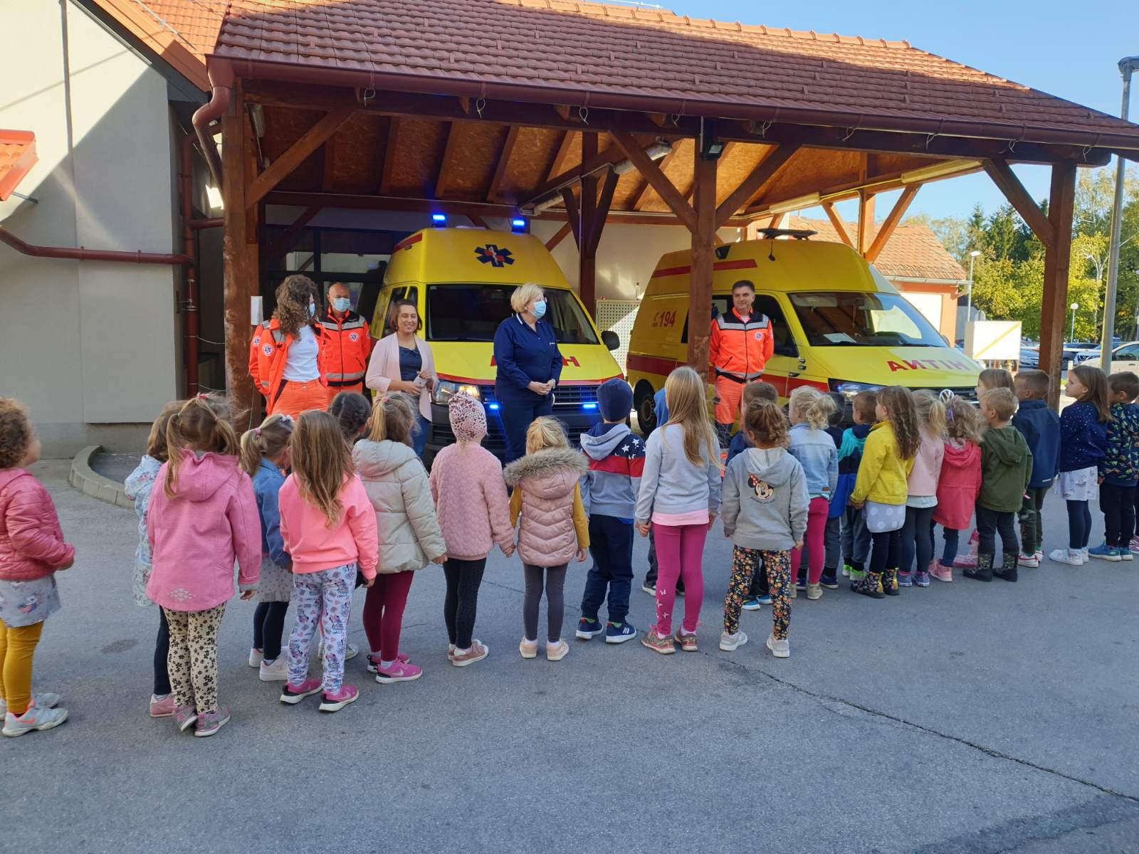 U utorak, 6. listopada djeca iz skupine Zvjezdice posjetila su Hitnu pomoć u sklopu Dječjeg tjedna. Kroz razgovor su djeca naučila broj Hitne pomoći, ali i u kojim slučajevima idemo na Hitnu jer nisu svi slučajevi hitni i neke možemo  sami sanirati. Najviše ih je razveselilo što su razgledali vozilo Hitne pomoći i imali su prilike vidjeti što se sve nalazi u vozilu. Upoznali smo i dva tima Hitne pomoći te naučili da se svaki tim sastoji od vozača, liječnika i medicinske sestre.  Hitna pomoć koristi zvučni signal tj. sirenu, ali ne uvijek nego samo kad im se jako žuri i kada je ugroženi nečiji život. Voditeljici Hitne pomoći predali smo likovne radove vozila Hitne pomoći koji su nacrtala naša djeca te im time zahvalili na posjeti. Zauzvrat su nas oni počastili bombonima i keksima. Ovim putem zahvaljujemo Irisinoj mami koja nam je dogovorila posjetu.