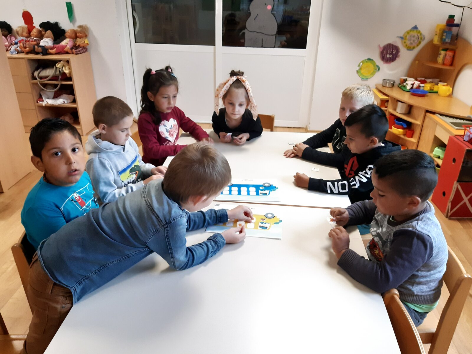 Dječaci pokazuju najveće zanimanje za tematiku prijevoznih sredstava. Vježbali smo imenovanje vozila te podjelu na vodeni, kopneni i zračni promet. Provedena je aktivnost izrade rakete s imenom (glasovna analiza vlastitog imena), kao i aktivnost provlačenja vezica kroz plastificirane kartice prijevoznih sredstava. Za kraj susreta djeca su se poigrala plastelinom, oblikujući vozila prema slikovnim predlošcima. Provedba spomenutih tematika bila je popraćena usko vezanim vježbama za razvoj fonološke osviještenosti i predmatematičkih vještina. Radne smo tjedne obogaćivali raznim didaktičkim materijalima i aktivnostima. Dolaskom sunčanih dana sve više vremena provodimo na otvorenom.