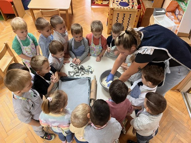 Nakon dodavanja sastojaka, došlo je vrijeme za miješanje tijesta. Mali prstići su marljivo gnječili tijesto, a osmijesi na licima pokazivali su koliko su uživali u procesu. Mama Anja strpljivo je pokazivala kako se tijesto valja, a djeca su s velikim zanimanjem uzela valjke u ruke i pokušala što bolje oblikovati pogačice. Ova aktivnost nije bila samo zabavna, već je pomogla i razvoju njihove motorike.