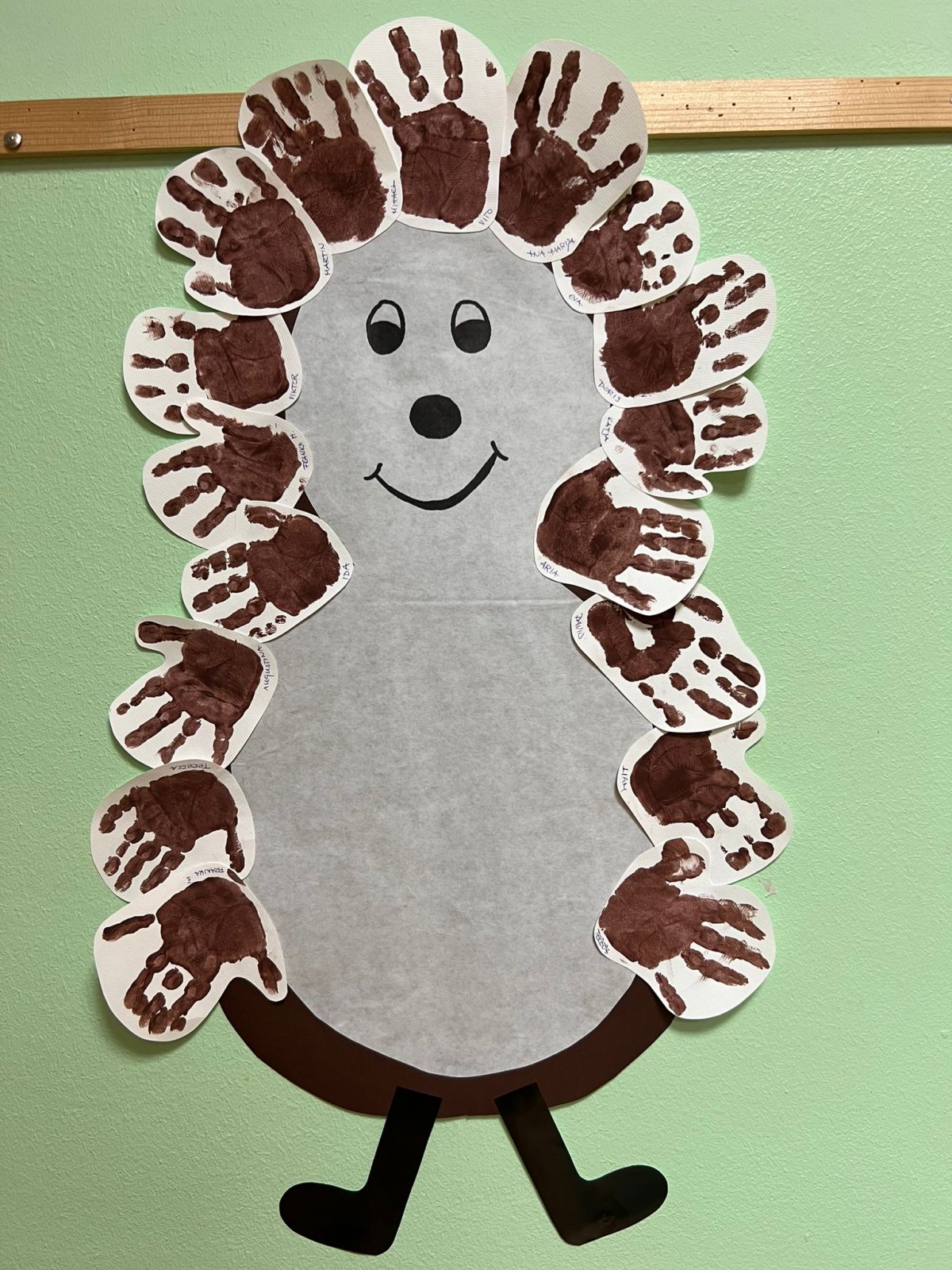 Likovnim aktivnostima vježbali smo samostalnost korištenja pribora i motoriku ruku, pa smo tako pomoću smeđe tempere bojali dlanove i otiskivali na papir te smo kartonskim tubama oslikavali bodlje. Otisnuti dlanovi poslužili su u izradi velikog ježa od papira, a imitirali su njegove bolje.