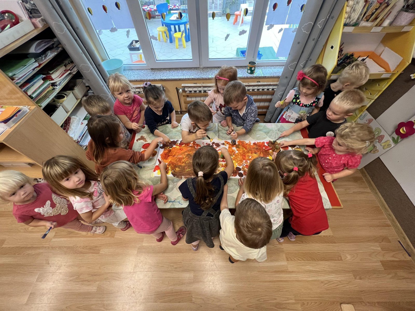 Tema ovog tjedna bila je bogatstvo jesenskih plodova. Osim imenovanja voća, povrća i plodova, djeca su imala priliku kušati jabuke čiji su okus zasladila cimetom, kakaom ili grožđicama. Kroz cijeli tjedan radili smo likovne aktivnosti, a djeca su se najviše radovala kada su izbojavala temperom. U tom jesenskom tonu, odgojiteljice su za svu djecu izvele lutkarsku predstavu “Izgubljena bodlja”, a potom su se svi zasladili jabukama.
