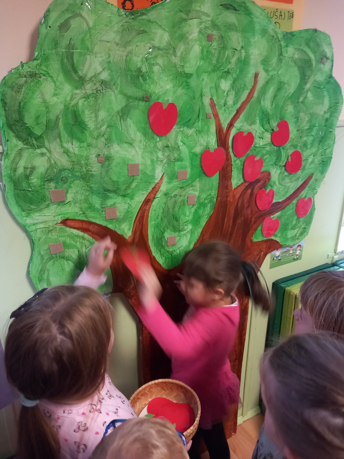 Pročitali smo priču “Kako je jabuka dobila zvijezdu”, te kroz didaktičku igru “Berba jabuka” spoznali gdje ona raste.