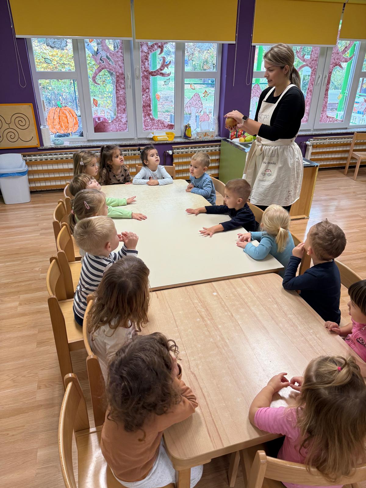 U likovnoj aktivnosti djeca su bojila jabuke temperama, prvi put koristeći kist i temperu, razvijajući pritom motoričke vještine i kreativnost. Tjedan smo završili kazališnom predstavom o jabuci, koja je nosila poruku o prijateljstvu i dijeljenju, potičući socijalni i emocionalni razvoj djece.