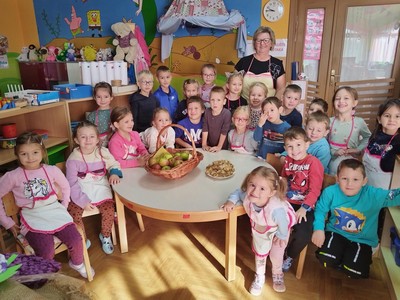 20.10. obilježava se Dan jabuka. Ovoj zdravoj voćkici posvetili smo cijeli tjedan. Razgovarali smo o vrstama jabuka, njihovom okusu, stanarima, zdravim sastojcima. Pokušali nacrtati presjek jabuke, poigrali se labirintom s jabukama. U posjet nam je stigla baka djevojčice koja je s djecom radila štrukle s jabukama. Mijesili su, pokušali razvlačiti, punili, omotali i ispečeno pojeli. Uz igrokaz „ Jabuka i crv“ naučili su kakvi stanovnici žive u jabuci, a isprobali su i napraviti put crvića vunom na kartonu. Manja djeca prstićem su crtala put crvića. Uz sve aktivnosti puno su konzumirala jabuke jer im je to najomiljenije voće. Slasno je svakako bilo.