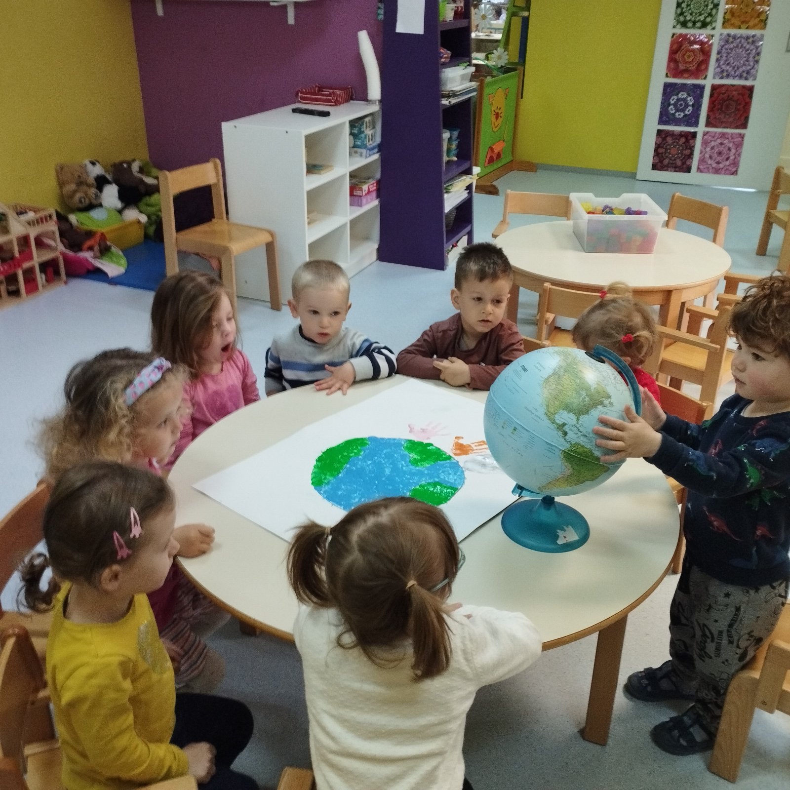 Cilj nam je da kod djece od najranije dobi potičemo ekološku osviještenost te s djecom provodimo aktivnosti vezane za ekologiju primjerene njihovoj dobi. Oblačići su proučavali globus i odlučili smo izraditi zajedničku likovnu aktivnost gdje su djeca tapkala planetu Zemlju temperama i plutenim čepovima, a zatim smo otisnuli dlanove djece oko naše planete te napisali poruku „Planeta je u našim rukama“. Slušali smo pjesmice o ekologiji i čitali slikovnice: „Zrak, voda i čista priroda“, „Zraka trebam, hitno!“, „Zatvori vodu!“ i „Što sve Ana zna… očuvanje prirode“. Svakodnevno smo boravili na svježem zraku u šetnji ili se igrali na našem igralištu.