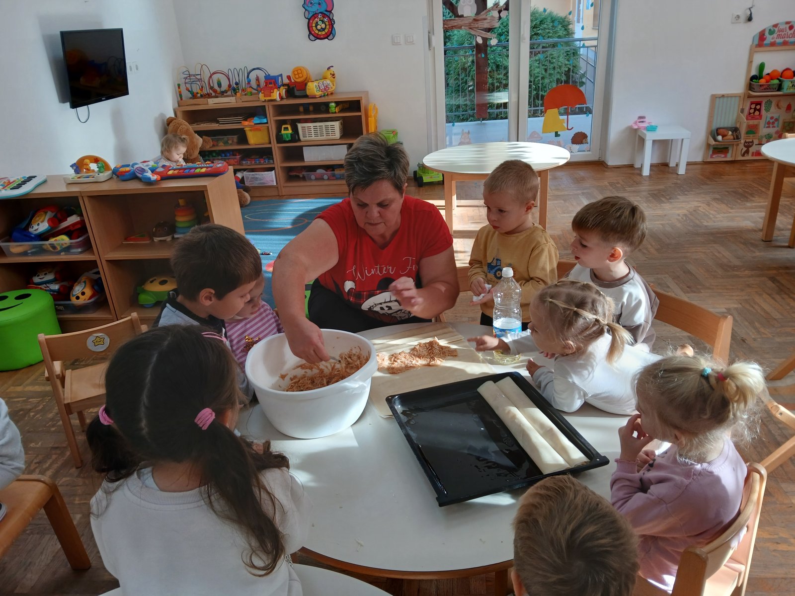 Posebno nas je razveselio posjet bake Vesne, koja je zajedno s djecom pripremila štrukle od jabuka. Djeca su s oduševljenjem sudjelovala u pripremi, promatrali su kako se jednostavni sastojci pretvaraju u ukusnu jesensku poslasticu. Miris pečenih štrukli ispunio je našu sobu i dodatno uljepšao dan!