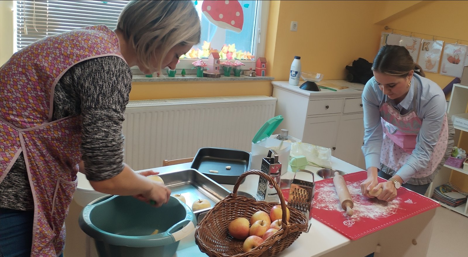 Povodom dana jabuka u našoj je skupini gostovala mama našeg Tome, mama Matea.Mama je s djecom izradila slasnu pitu od jabuka. Djeca su s mamom mijesila tijesto, dodavala sastojke te ribala jabuke. Na kraju su naše Ribice u slast pojele pitu. Ostatak tjedna smo posvetili istraživanju krušaka i grožđa. Likovno su djeca otiskivala grožđe temperom i pluto čepom ,dok su na predložak kruške lijepili papire koje su prije izrezali. Taktilno su isprobavali krušku,jabuku i grožđe.Spoznali su dijelove voćaka te usvojili nove nazive (plod , kora, koštica , peteljka). Finu motoriku šake vježbali su rezanjem krušaka i jabuka noževima. Nakon što su izrezali voće , nizali su izrezane komade na štapiće te su dobili voćne ražnjiće koje su slasno pojeli. Slušali su razne igrokaze i priče na temu voća i usvajali pjesmice : Kruška , jabuka, šljiva i Jabučice crvena. Za kraj tjedna odradili smo sat TZK-a gdje su se na kraju natjecali u igri balon putuje. Ovim putem zahvaljujemo mami Matei na druženju te se radujemo novoj suradnji. Kako je protekao tjedan pogledajte u fotogaleriji.