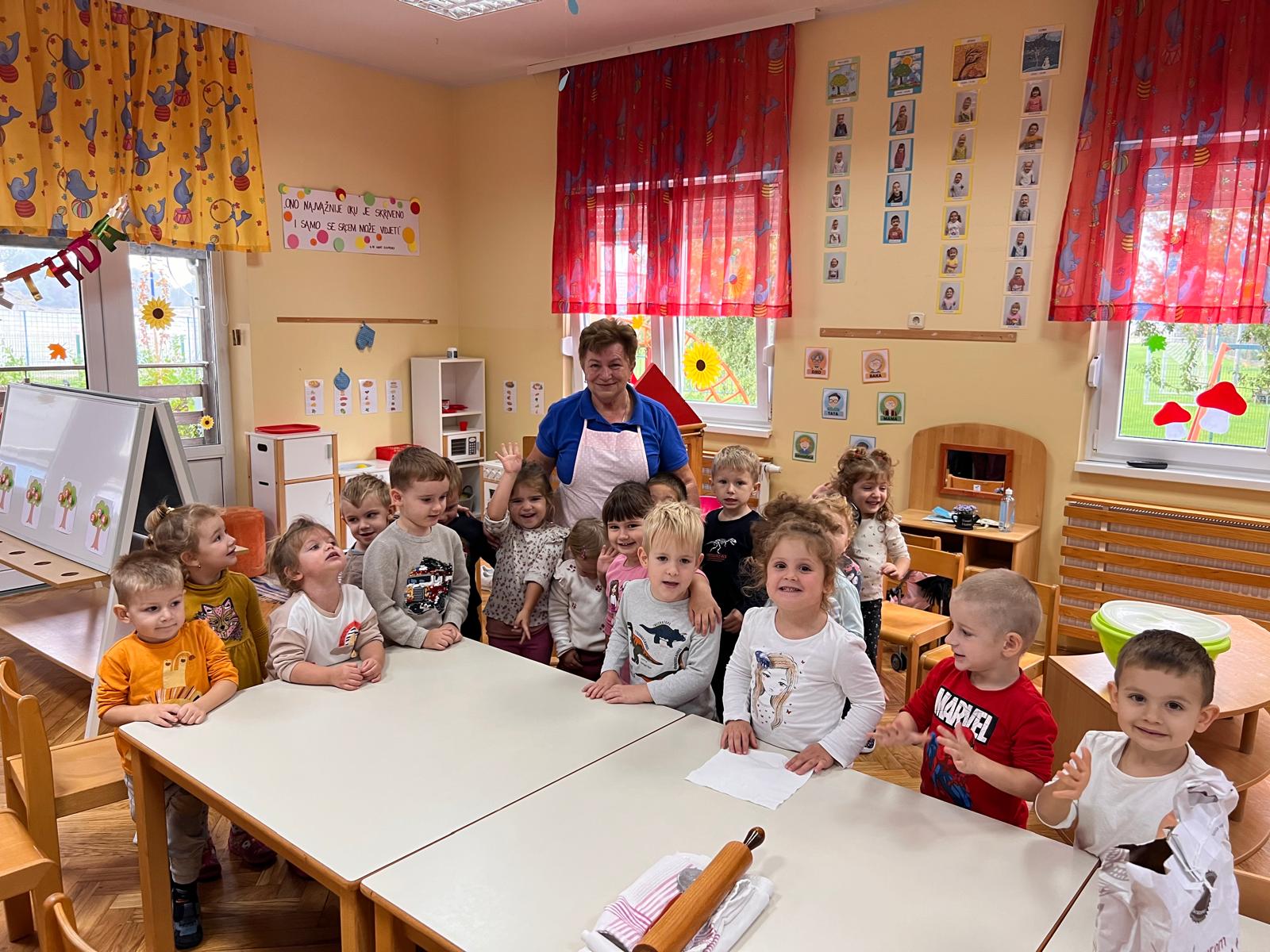 Najzanimljivija aktivnost ipak je bila miješenje kiflica i posjet bake Horvat. Ona je djeci objasnila kako se mijesi tijesto, pokazala im kako ga valjati i motati u kiflice, a Bombončići su se i sami u tome okušali uz bakinu pomoć. Ovim putem još jednom zahvaljujemo baki Horvat na posjetu i ugodnom druženju.