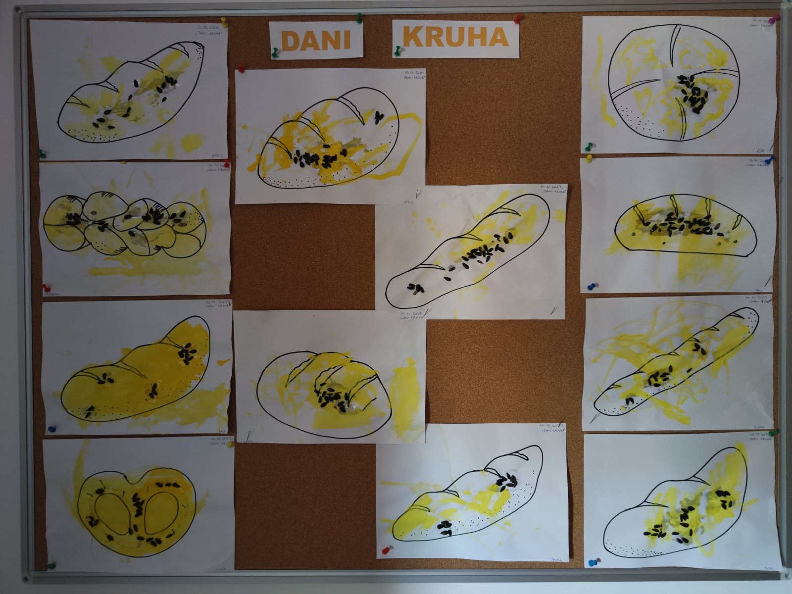Prošli tjedan Pandice su obilježile Dane kruha i zahvalnosti za plodove zemlje. Djeca su razvijala finu motoriku šaka korištenjem ljepila za izradu plakata. Ugostili smo mamu Petru Š. koja je s djecom izvela aktivnost izrade tijesta za kruh. Sva djeca su sudjelovala u izradi i dodavanju sastojaka za kruh. Uspoređivali smo mirise soli, brašna i kvasca. Djeca su za vrijeme aktivnosti nosila svoje male pregače i kuharske kape koje nam je izradila mama Petra. Nakon izrade tijesta djeca su imala prilike modelirati vlastita peciva i kolače od slanog tijesta. Kasnije smo za užinu i degustirali naš kruh. Kroz tjedan promatrali smo i različite sjemenke i žitarice te uspoređivali njihov oblik i boju. Likovno smo se izražavali temperama pa je tako svako dijete naslikalo svoj kruh te ga ukrasilo sjemenkama. Razvoj pamćenja, govora i glazbenog stvaralaštva razvijali smo kroz pjesmicu s pokretima “Pekar” te kroz usvajanje stihova iz igrokaza “Djedova pogača”.