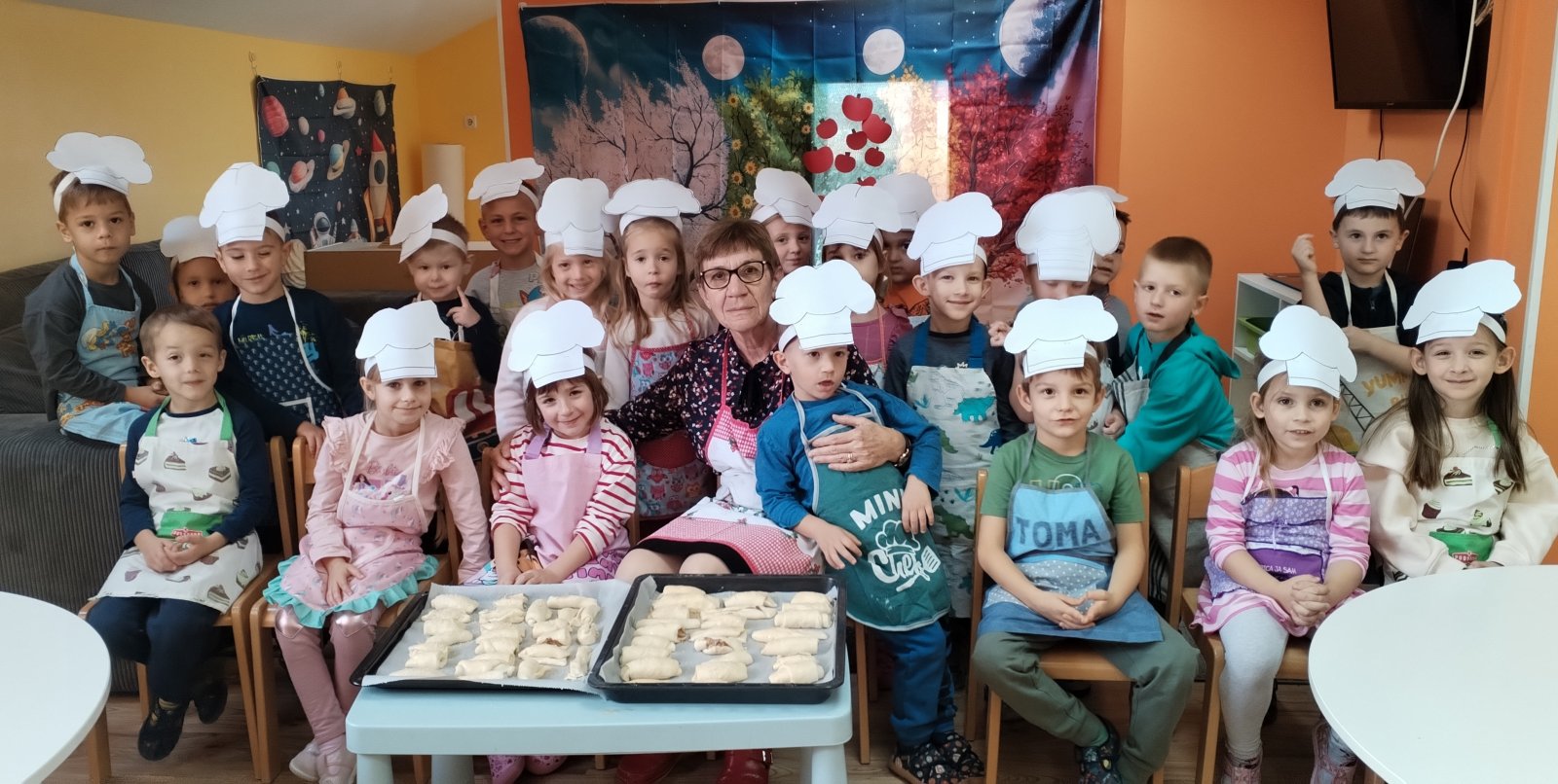 (pletenice, pužiće i male kruščiće) koje ćemo dok se temeljito osuše obojit, te ćemo ih iskoristit za simboličke igre u obiteljskom centru. Od kukuruznog brašna izradili smo mala peciva koja su također pojeli za užinu. U skupini je gostovala baka Božica, baka naše Grete koja je djeci ispekla i donijela slasne kiflice. Baka je s djecom radila slatke kiflice s linoladom. Djeca su s bakom valjala tijesto valjkom, punila linoladom i rolali u kiflice.