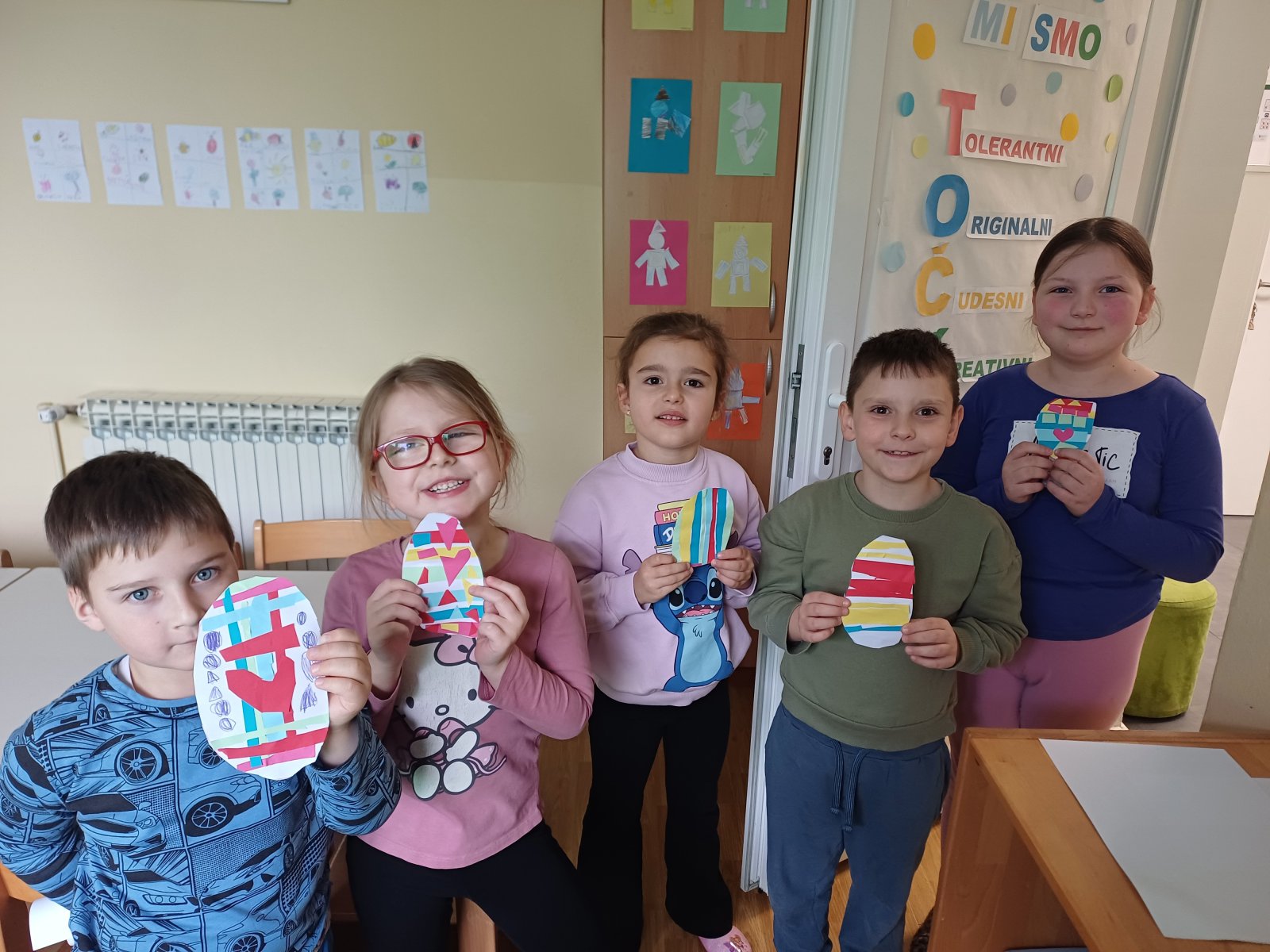 Uskrs smo obilježili izradom prigodnih čestitki i usvajanjem sintagme Happy Easter, a posebnu radost donijela je natjecateljska igra s jajima kroz koju su djeca razvijala suradnju i natjecateljski duh.