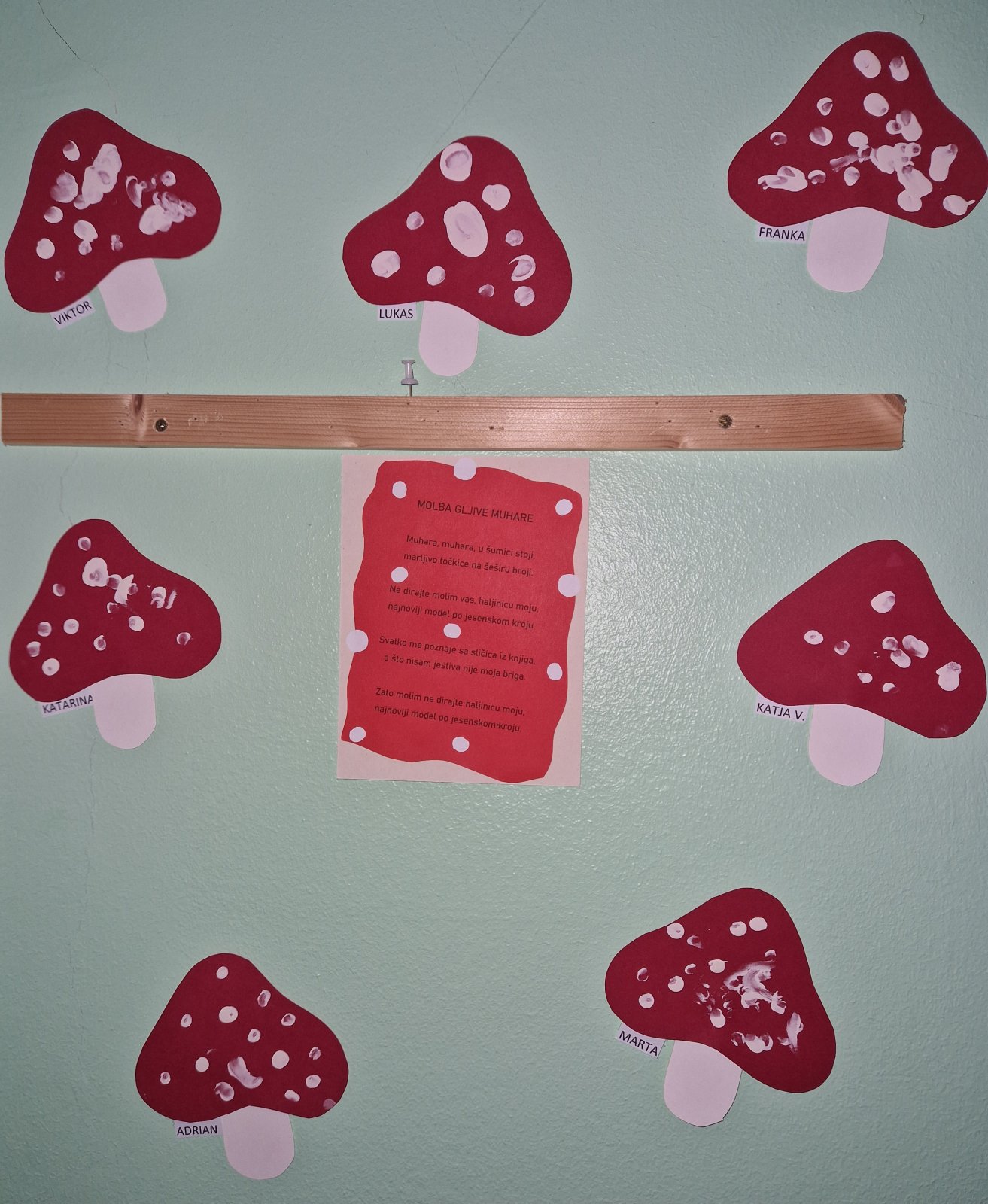 Kako je djeci vizualno privlačna muhara zbog svog specifičnog izgleda, u likovnoj aktivnosti temperom su prstićima ukrašavali njen klobuk.