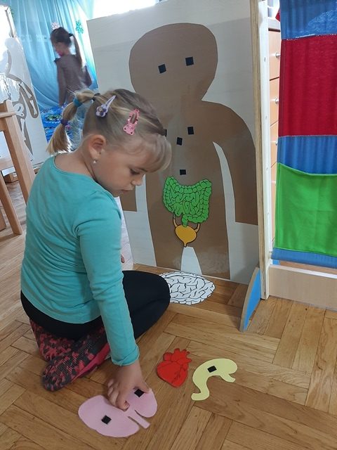 Dijelove tijela upoznali smo uz različite slikovnice, knjigu Kako radi tvoje tijelo, enciklopedije, fotografije, videozapise Ljudsko tijelo, različite poklapalice, slagarice, plakate s unutarnjim organima i kosturom. Likovno smo se izražavali crtajući sebe, oblikovanjem čovjeka plastelinom te rezanjem i lijepljenjem predloška kostura.
