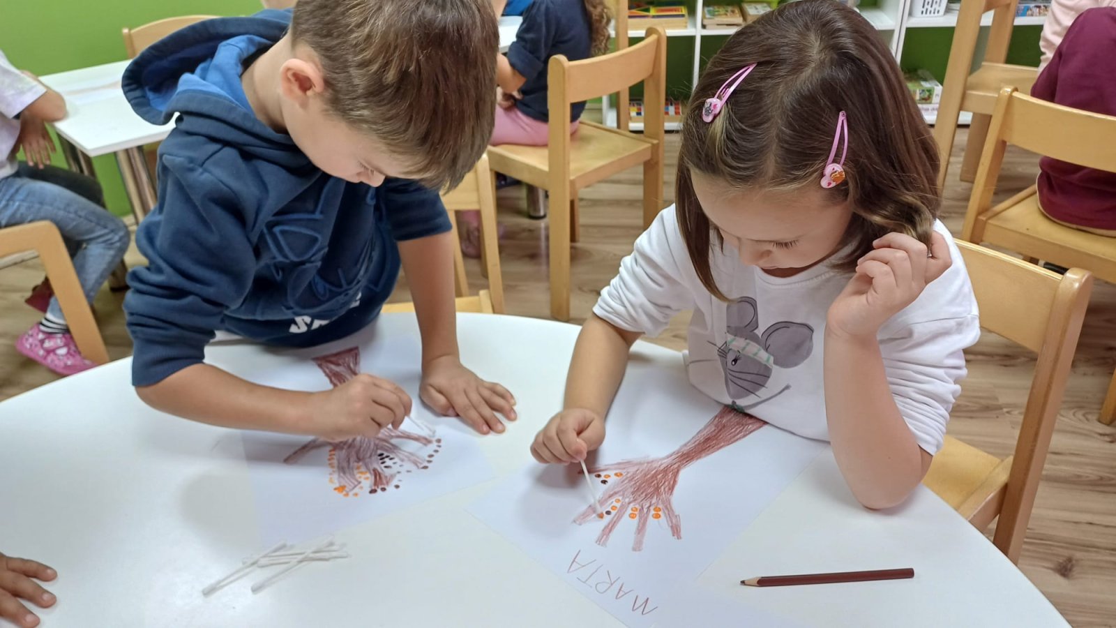 Podosta smo i sa svojim odgojiteljicama vježbali grafomotoriku, slova i brojeve na jednostavne i zanimljive načine kroz jesenske simbole. Izražavali smo se likovno, temperama, bojicama, flomasterima, kolažom… Slikali smo jesensko drvo, crtali bundeve i tikve te crtali na temelju promatranog i gledanog. Radovi su ispali zaista sjajni. Također smo izrađivali i gljive muhare te naučili pjesmicu ̋Muhara ̋. Vježbali smo i finu motoriku praveći linije i oblike od kukuruznih zrna. Pročitali smo podosta slikovnica te vježbali aktivno slušanje, razmišljanje o pročitanom te razgovor o onome što smo čitali.