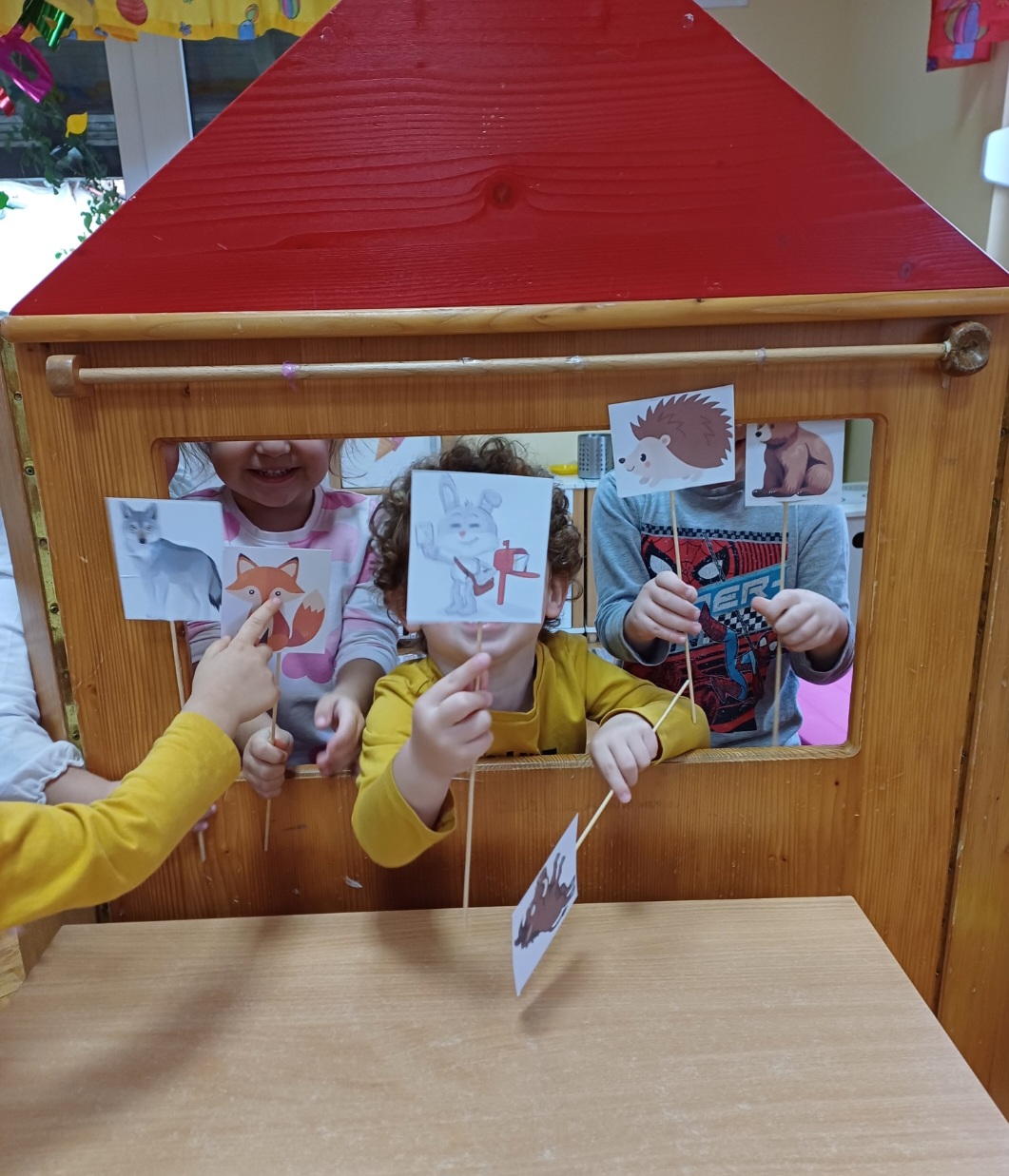 Ovim stihovima započeli smo tjedan posvećen aktivnostima kojima smo pobliže upoznali ježa. Čitanjem priče „Ježeva kućica“, B. Ćopića djeca su upoznala sve važne informacije koje su im pomogle u izvođenju predstave. Predstavu su izvodila djeca s pomoću štapića na kojem su bile slike životinja iz priče. Izazovniji zadatak za Bombončiće bilo je slaganje sličica priče prema odgovarajućem redoslijedu.