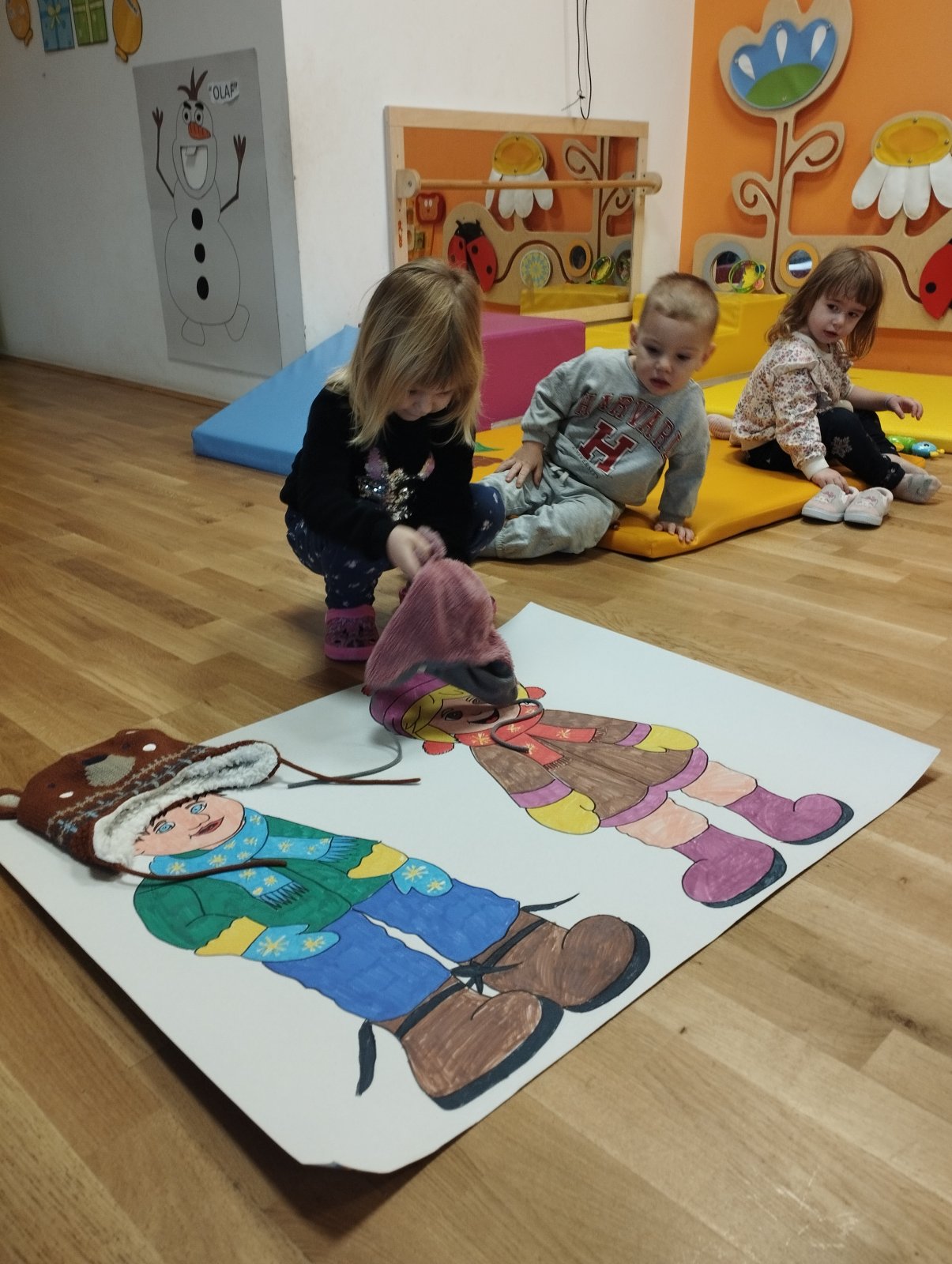 Kako se odijevamo zimi? Koju obuću nosimo? Čemu služe kapa, šal i rukavice? To su neka od pitanja kojima smo se bavili proteklog tjedna. Sve aktivnosti bile su nam usmjerene na usvajanje naziva tih odjevnih predmeta, na ponavljanje boja ali i na poticanje spretnosti i samostalnosti u svakodnevnim životno – praktičnim aktivnostima, a to su preskidanja, prezuvanja, odlaganja odjeće u garderobne ormariće. Pjevali smo pjesmice, čitali slikopriču “Zimski dan”, gledali igrokaz “Snjegovićevo odijelo”, u likovnim aktivnostima izrađivali kapu, šal i rukavice. Djeca su pokazala interes za ponuđenim raznovrsnim igrama te na taj način pridonijeli kvalitetnoj realizaciji teme.