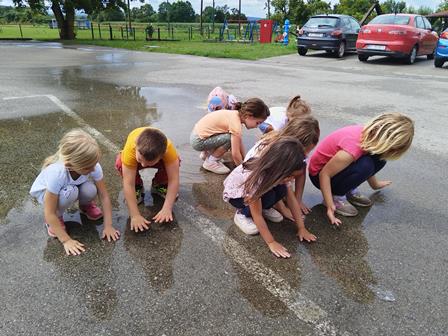 Sunce je zdravo za čovjeka, ali predstavlja i opasnost. Razgovarali smo o opasnostima od sunca- što radi, kako osjetimo da peče i po čemu vidimo? Što se dogodi kad smo dugo na suncu, kako se zaštititi. Naučili smo da kožu treba mazati kremom za zaštitu, a glavu čuvamo noseći kape. Naučili su da postoje i ljetne opasnosti kojima svjedoče ovih dana. Ljetne oluje donose velike količine kiše pa se stvaraju i lokvice koje djeca obožavaju. Igrali smo se i mi u njima. U likovnoj aktivnosti izrađivali su sunce sa svim svojim zrakama. Većinu vremena smo proveli na zraku u igri iščekujući ljetne praznike kojima se djeca jako vesele.