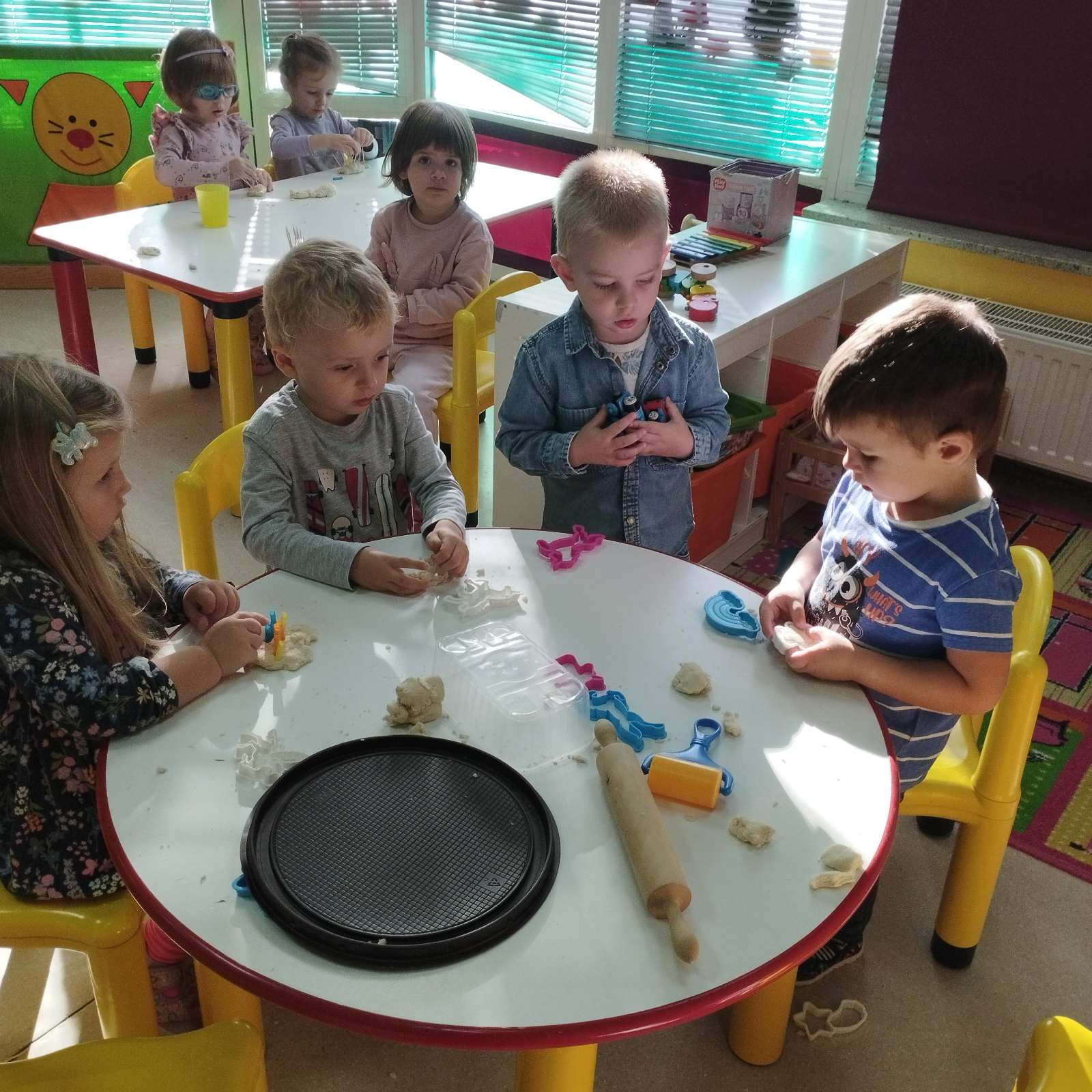 U sklopu teme „Dani zahvalnosti za plodove zemlje – Dan kruha“ svakodnevno smo provodili aktivnosti s plastelinom – izrađivali kolačiće, rezali, mijesili, otiskivali, oblikovali, spajali. Izradili smo likovne radove „Kukuruz“ tehnikom tempere aplicirajući boju duplo kockicom na predložak kukuruza te „Čokoladni muffin“ tehnikom tempere otiskivanjem dlana. Radovi sada krase naš hodnik i sobu dnevnog boravka. Osim kreativnog izričaja koji se događa prilikom likovnog izražavanja, djeca uvježbavaju, razvijaju te ih se potiče na strpljivost, preciznost, urednost, učenje metodom pokušaja i pogrešaka, razvijaju taktilnu osjetljivost, koordinaciju pokreta oko- ruka. Tjedan smo zaokružili integriranim danom s odgojnom skupinom „Oblačići“ – pogledali smo dramsku izvedbu igrokaza „Djedova pogača“ koju su pripremile odgojiteljice odgojne skupine „Oblačići“. Djeca su se nakon predstave družila uz grickalice te pjevanje pjesmica „Pogača sam ja nestašna“, „Pekar“, „Mlin“, „Ja posijah lan“ i „Jedna vrana gakala“. Druženje smo nastavili u vrtićkom dvorištu gdje smo iskoristili sunčan dan crtajući kredama, šetnjom, u interakciji s djecom iz ostalih skupina.