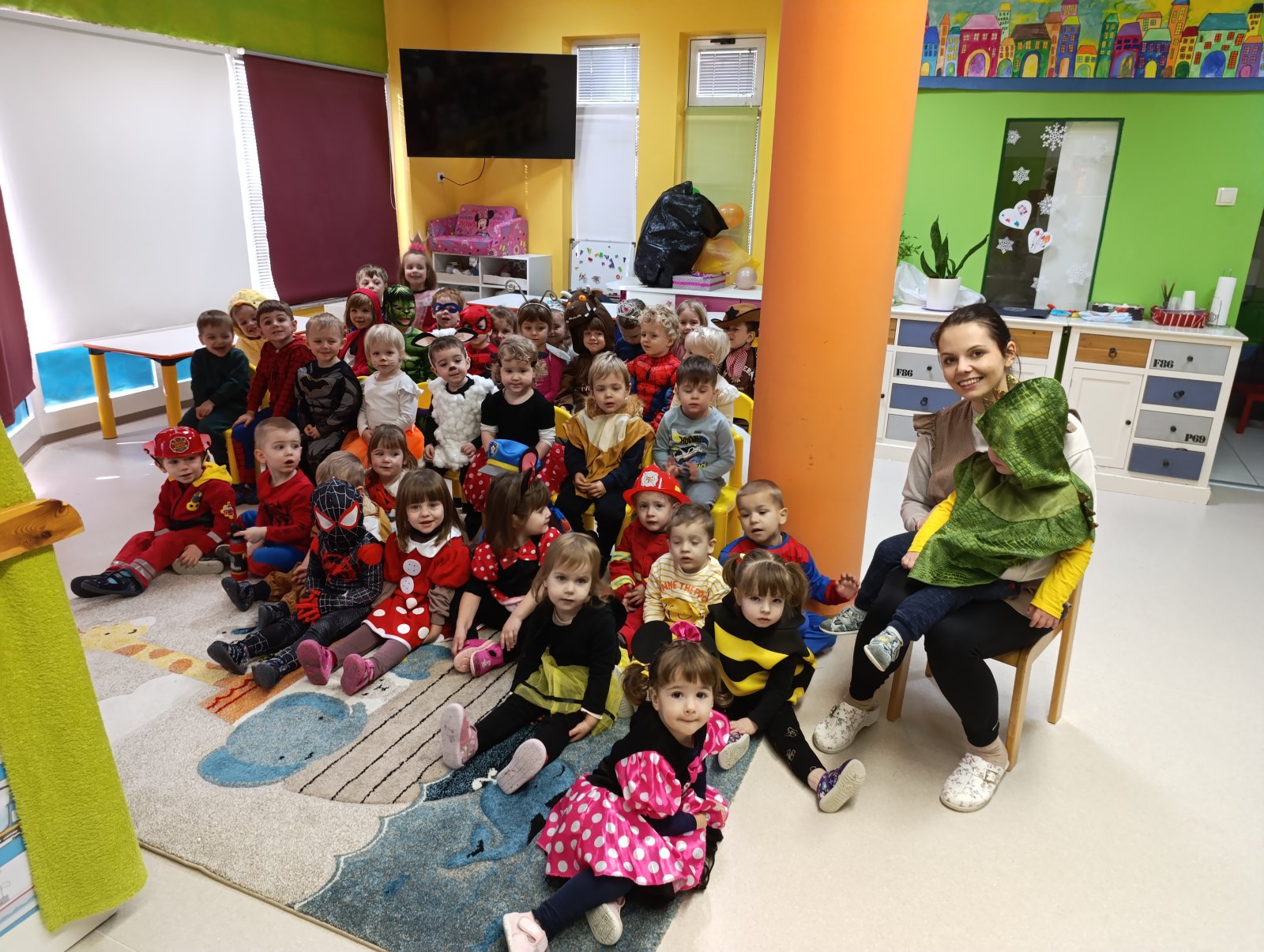 Djeca su prvo pogledala lutkarsku predstavu „Vesela i tužna maska“, a zatim smo druženje nastavili u veselom tonu plešući pod maskama i s balonima. Posjetio nas je i naš prijatelj Borna kojem smo se jako razveselili. Pjevali smo pjesmicu „Mi smo male maškare“ te slušali audio priču „Elmer“.