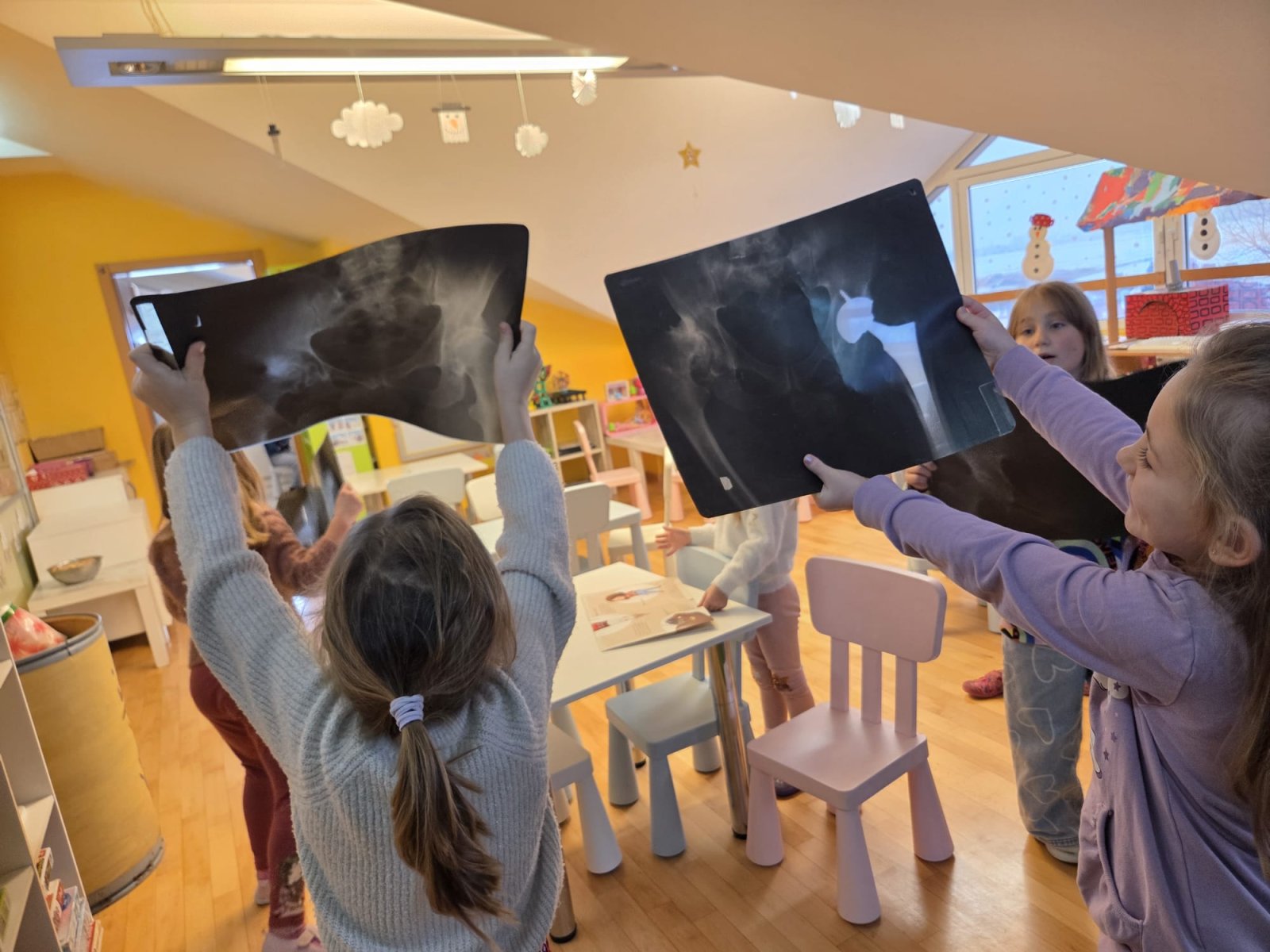 Kao i obično, jutra smo započinjali razgibavanjem i tjelovježbom, a tjedan nam je svakako bio raznolik i dinamičan, a započeli smo s razgovorom i ponavljanjem da vidimo koliko toga do sada smo već naučili i znamo. Proširili smo znanje s razgovorom o našem dišnom i krvožilnom sustavu, a i isprobali smo na modelu od kartona, slamki i balona upuhivati zrak u pluća kako bi uvidjeli kako to zaista funkcionira. Imali smo priliku i promatrati kosti na rendgenskim snimkama te smo izrađivali model šake od slamki kako bismo promatrali kretanje zglobova u rukama.