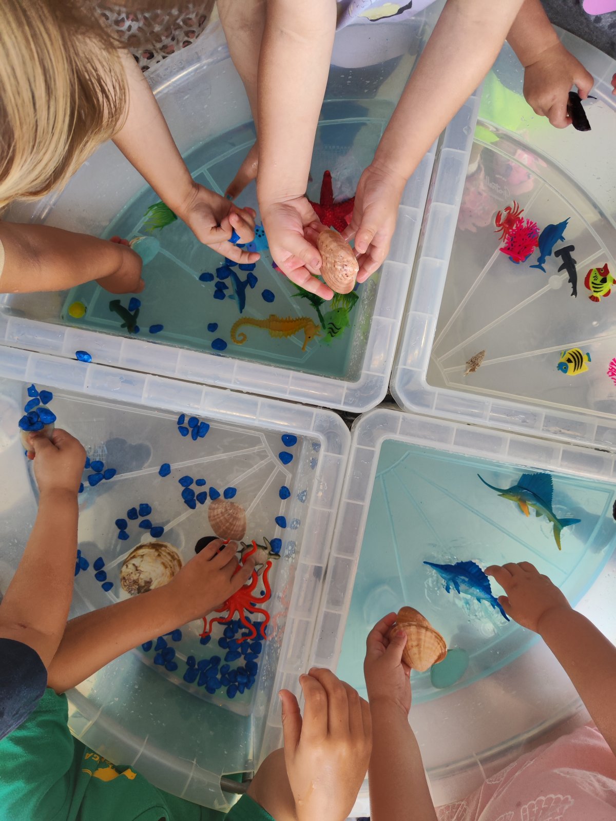 Nakon proučavanja mora i njegovih obilježja, odlučili smo proučiti morske životinje. Pomoću raznih edukativnih filmova i enciklopedija upoznali smo životinje koje stanuju u dubokom moru. Neke od njih smo likovno prikazivali koristeći različite likovne tehnike kao što su kapanje vode u boji, akvarel, kolaž. Ponovno smo naš senzorni bazen napunili vodom, kamenčićima, umjetnim algama i PVC životinjama. Također, u vodi smo otopili sol kako bi ona bila što sličnija morskoj. Na taj način djeca su stjecala iskustvo istraživanjem različitih agregatnih stanja tvari, te njihove topljivosti. Čitali smo priče na temu, plesali i pjevali pjesmice o morskim životinjama.