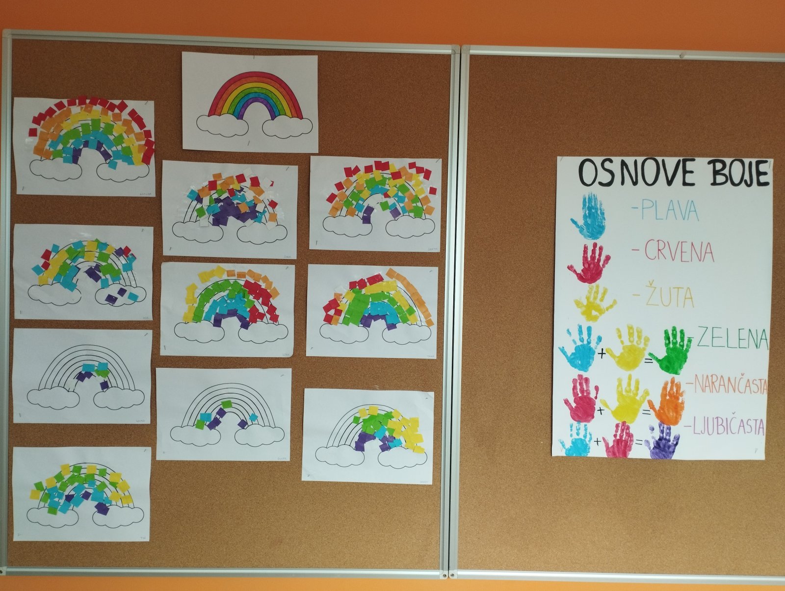 Nakon kraćih božićnih i novogodišnjih praznika ponovno smo se okupili u vrtiću te smo nastavili s radom na našem projektu “Upoznajemo boje”. S obzirom da je vani zahladilo, pao je i snijeg, mi smo odlučili istražiti i sami napraviti led u boji kojim smo potom slikali na velikom papiru. Od tempera i otiska dlana napravili smo plakat “Osnovne boje”, a od kockica kolaž papira šarenu dugu. Kroz igre, pjesmicu “Boje” te slikovnice “Šarenu gusjenicu prati i boje ćeš znati”, “Boje” ponavljali smo i usvajali nazive osnovnih boja te poticali djecu na njihovo uočavanje u svojoj neposrednoj okolini.