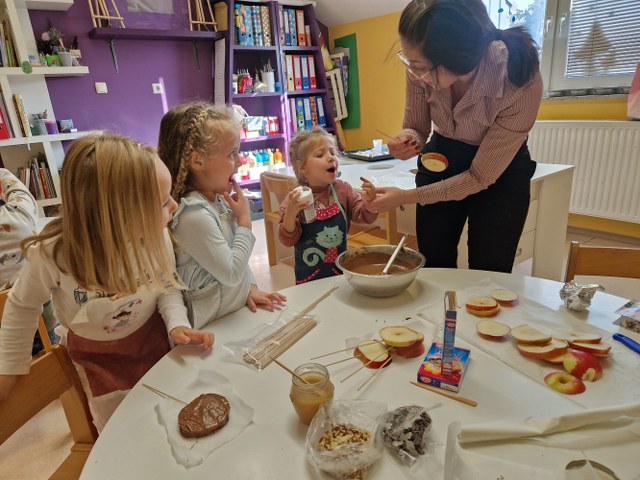 Povodom Dana jabuka, 20. listopada, skupina Oblačići uživala je u mirisima, okusima i zanimljivim spoznajama o ovom omiljenom jesenskom voću. U goste nam je stigla mama naše Lucije, gospođa Ivana Galinec, koja je s djecom razgovarala o izgledu jabuke, njezinim dijelovima, vitaminima i zdravim sastojcima koje sadrži. Zajedno smo otkrivali što se sve „krije“ u jabuci i zašto je važno redovito je jesti. Nakon razgovora uslijedio je najslađi dio dana – izrada slastica od jabuka i lisnatog tijesta. Najviše oduševljenja izazvala je izrada lizalica od jabuka umočenih u otopljenu čokoladu, koje su djeca zatim ukrašavala karamelom, šećernim ukrasima i sjeckanim lješnjacima.