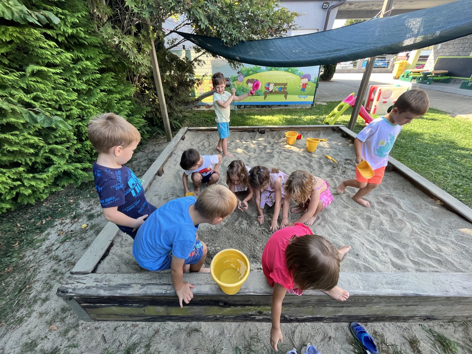 Svakodnevno smo se bavili i temom pijeska jer ne prođe niti dan da Sovice ne izraze želju za igrom u pješčaniku. Razgovarali smo o vrstama pijeska, proučavali ga povećalom, dolijevali vode na njega, prosijavali ga, imenovali životinje koje ga vole i žive u/na njemu, ali i okušali istraživačke sposobnosti tražeći razne školjke i kamenje unutar pijeskom ispunjene posude. Osim navedenoga, Sovice su imale priliku zajedno s odgojiteljicom izraditi i kinetički pijesak, a kasnije se i igrati s njim razvijajući pritom finu motoriku i taktilnu percepciju. Likovne aktivnosti bile su usmjerene na crtanje po slobodnoj volji, ali i bojankama na temu raznih vrsta školjaka, rakova, morskih zvijezda i ostalih životinja koje vole pješčano dno.