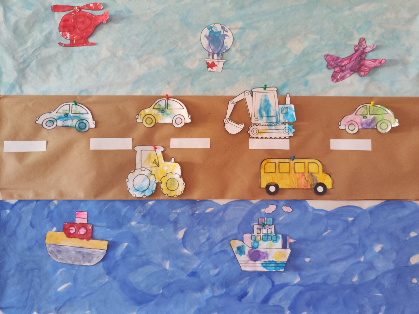 Starija djeca prepoznala su sva prijevozna sredstva, te su ih s lakoćom svrstala u koji promet ona pripadaju. Potaknuti time izradili smo zajednički plakat. Prvo smo obojali prijevozna sredstva, nakon tog obojali smo i podlogu koja je predstavljala more i nebo, a od kartonskog papira izradili smo cestu, te smo vozila koja smo prvobitno oslikali svrstali u koji promet pripadaju. Kroz likovnu aktivnost, također smo bojali tuljce koje smo zatim iskoristili i od njih napravili avione.