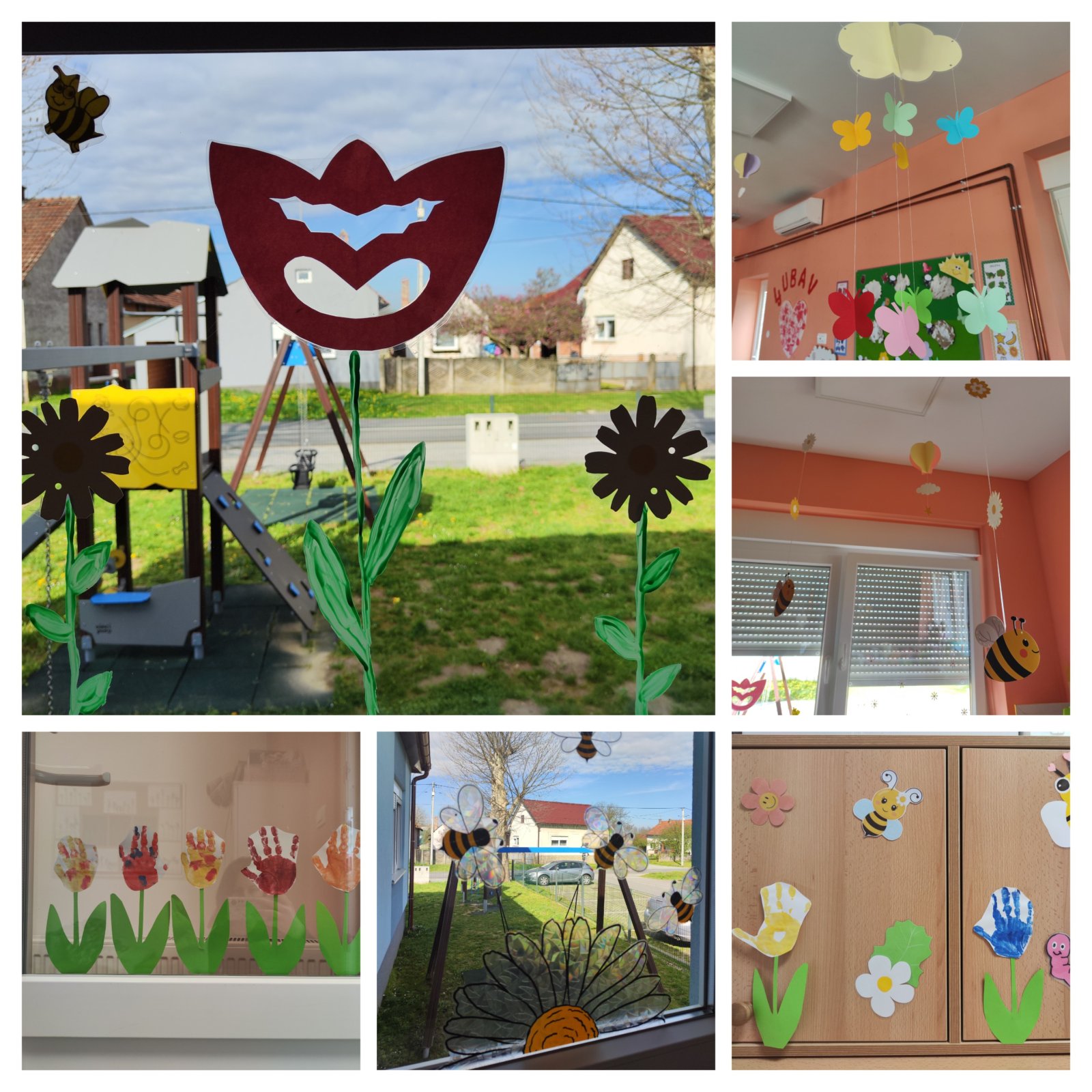 Promatrali smo boje i izgled svake proljetnice, mogli smo ih i pomirisati, a da bi razvijali govor i govorne vještine svakodnevno smo ponavljali njihova imena. Šarenilo boja u proljeće potaknulo nas je na slikanje vjesnika proljeća. Tako smo temperama i štapićima napravili zumbule, a od kartona za jaja, koje smo oslikali proljetnim bojama, napravili smo tulipane. Na kraju smo radovima ukrasili sobu dnevnog boravka, kako bi i ona odisala proljećem.