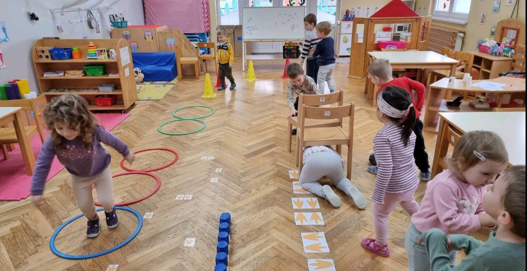 Kroz razne igre djeca su razvijala spacijalnu inteligenciju, snalaženje u prostoru, pokretljivost u svim oblicima kretanja. Istim aktivnostima ponovili smo znanje o bojama (imenovanje, prepoznavanje, uparivanje). Poticali smo samostalnost u svakodnevnim aktivnostima i uživali u igrama na svježem zraku.