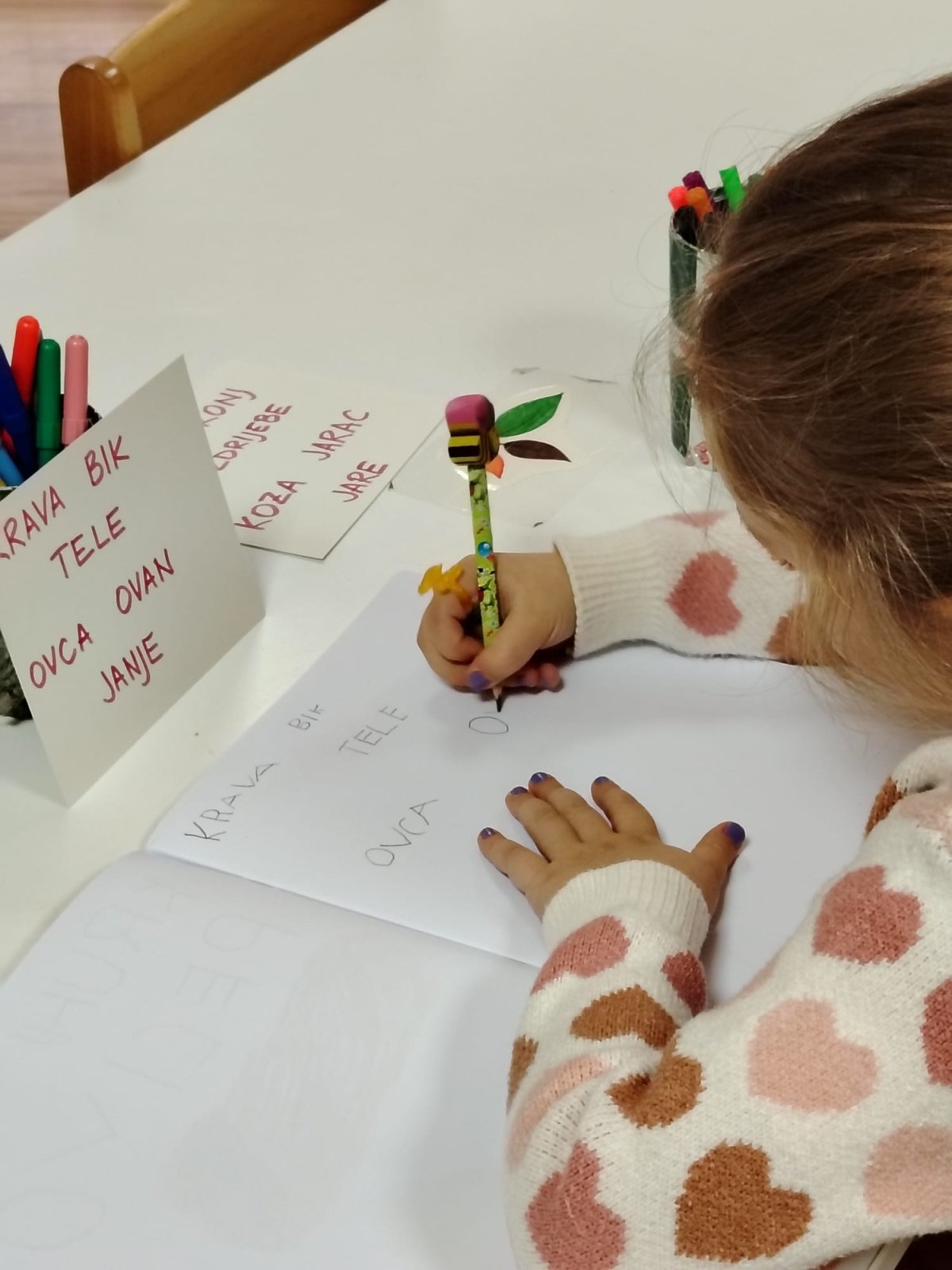 Prilikom tjedna posvećenog temi domaćih životinja, prisjetili smo se i nabrojali koje su sve domaće životinje. Promatrali smo videe s istima te primjećivali kako izgledaju, kakvog su rasta ta kakvih sve boja mogu biti. Povezivali smo mladunčad s odraslim jedinkama, a svatko je odabrao njemu najdražu životinju pa smo ju onda pokušali i likovno prikazati. Također smo i izrađivali našu ̋koku s jajima ̋, pritom uvježbavajući finu motoriku oblikovanjem papira sa škaricama. Ispisivali smo i slova i riječi vezano uz temu te ponavljali i učili brojanje do 20. Naučili smo igrati igru ̋glazbene stolice ̋ za koju se ispostavilo da nam je vrlo zabavna.