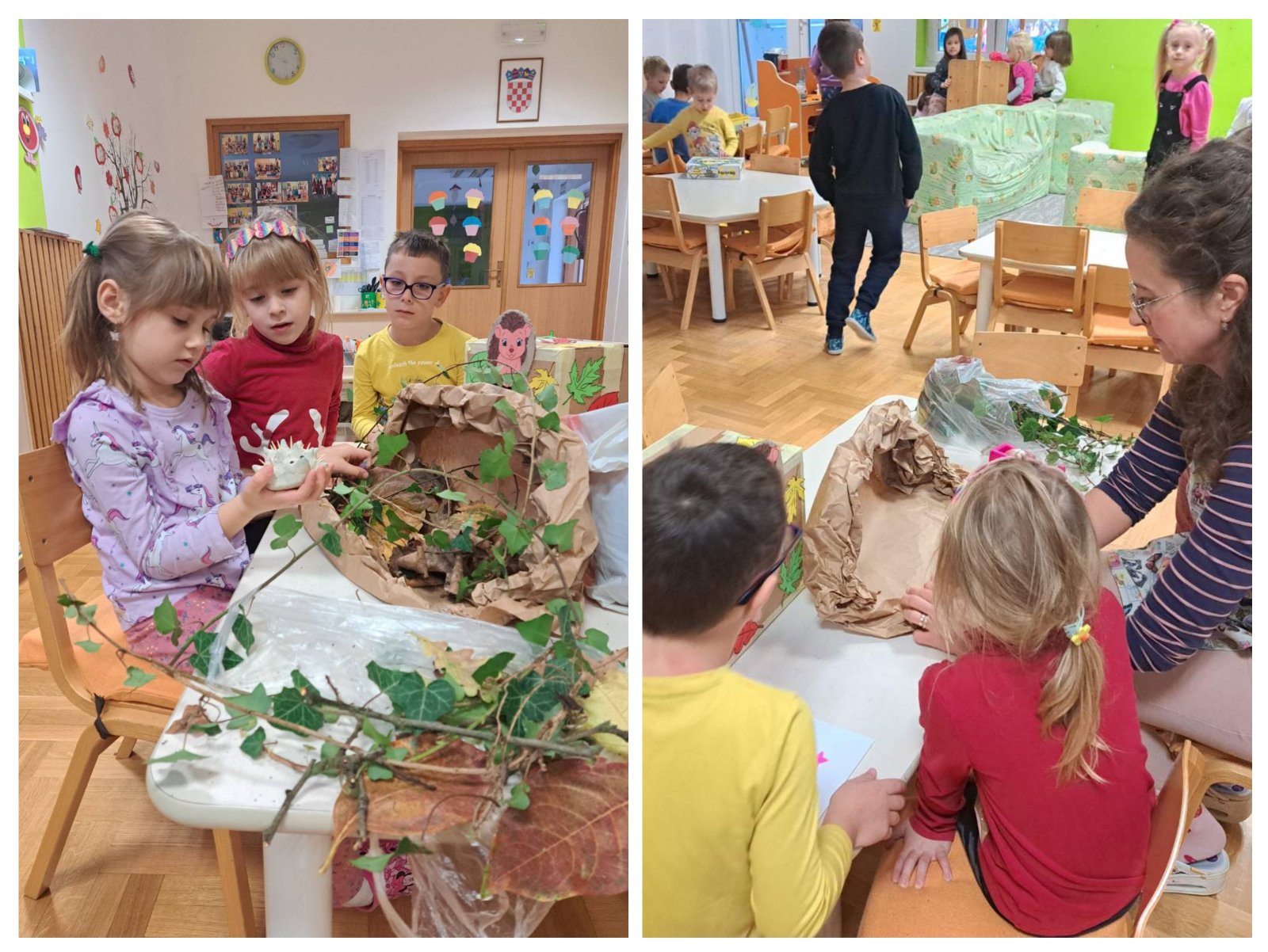 Izradili smo i našu ježevu kućicu od prirodnih materijala u čije prikupljanje su se uključila i sama djeca.