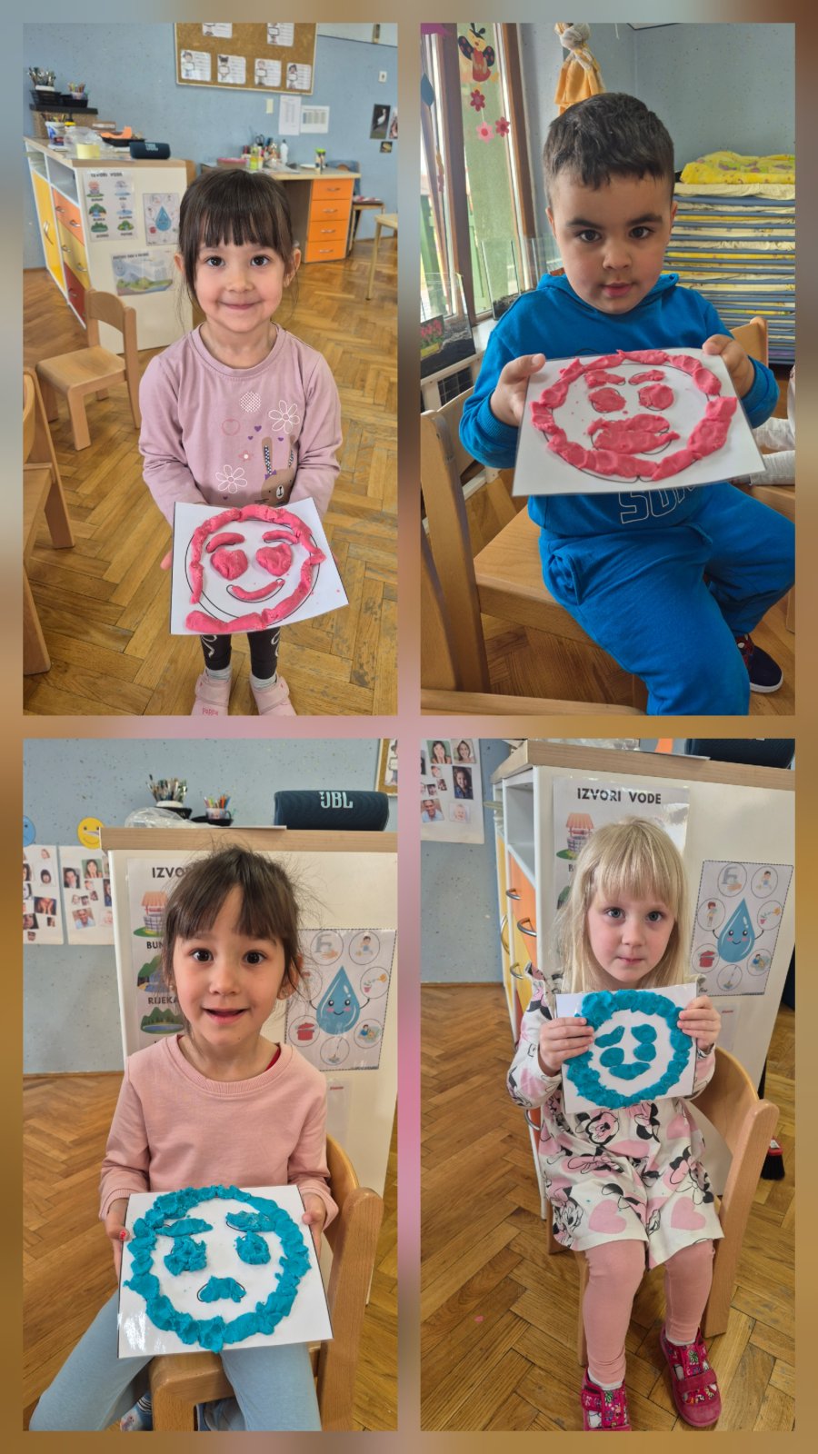 Srijeda je bila posvećena razvoju pažnje i samoregulacije. U aktivnosti „Gledam kako vrijeme prolazi“ djeca su u tišini promatrala pješčani sat, učeći strpljenje, koncentraciju i osnovno razumijevanje protoka vremena. Kroz izradu plakata „Emocije“ djeca su prepoznavala i imenovala različita emocionalna stanja, dok su modeliranjem plastelinom na predlošku lica izražavala vlastite doživljaje emocija. Ove aktivnosti pomažu djeci u razvoju emocionalne pismenosti i razumijevanju sebe i drugih.