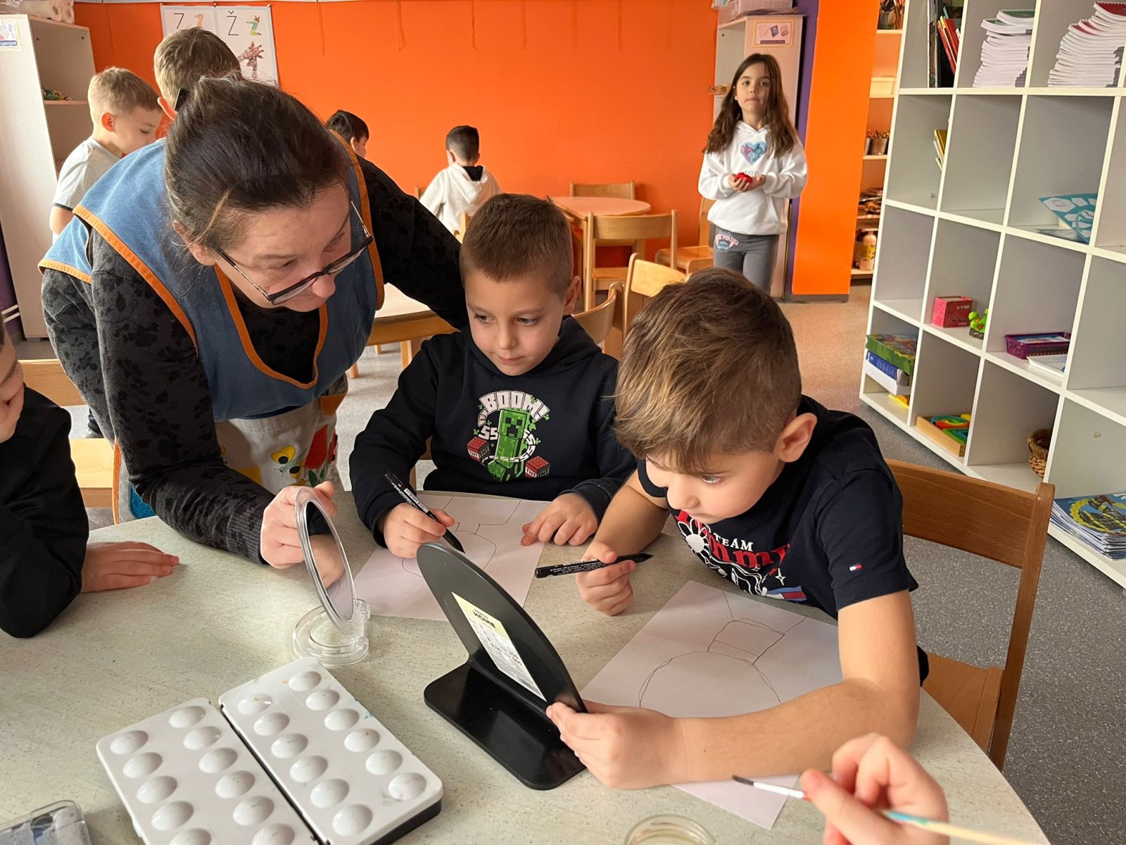 Likovno smo se izražavali crtanjem vlastitog portreta na temelju promatranja – najprije markerom i akvarelom, a kasnije i olovkom, pri čemu su djeca razvijala samopouzdanje i sposobnost opažanja detalja. Izradili su i mozaik svog imena, čime su dodatno naglasili vlastiti identitet i kreativnost.