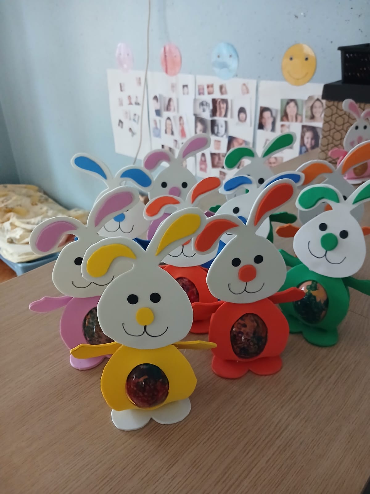 U tjednu od 30. ožujka do 3. travnja u našoj odgojnoj skupini Bombončići provodile su se tematski usmjerene aktivnosti povodom nadolazećeg blagdana Uskrsa. Kroz pažljivo osmišljene sadržaje nastojali smo poticati cjelovit razvoj djece, s naglaskom na kreativno izražavanje, razvoj fine i grube motorike te socijalnih vještina. Djeca su sudjelovala u likovnim aktivnostima bojanja uskrsnih jaja različitim tehnikama, čime se poticala njihova kreativnost, istraživački duh i razvoj preciznosti u radu. Poseban interes izazvala je aktivnost ukrašavanja velikog kartonskog zeca tehnikom točkanja, pri čemu su djeca razvijala koordinaciju oko–ruka. Završni rad izložen je na vratima sobe, čime se dodatno osnažuje dječji osjećaj postignuća i pripadnosti skupini.