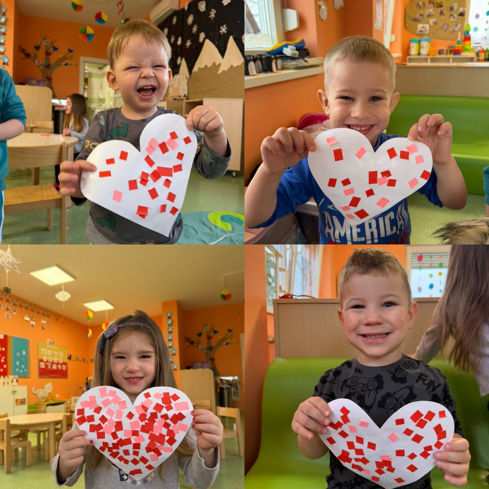 U kreativnom dijelu aktivnosti mališani su s velikim interesom sudjelovali u raznim likovnim zadacima. Srca smo ukrašavali krep papirom, razvijajući pritom finu motoriku i koordinaciju oko–ruka. Posebno zanimljiva bila je izrada srca s pomoću papirnatog tuljca i tempere – otiskivanjem su djeca istraživala oblike i stvarala jedinstvene uzorke. Veliko oduševljenje izazvalo je bojanje srca od ubrusa obojenom vodom uz pomoć pipeta. Djeca su pažljivo kapala boju i promatrala kako se ona širi po papiru, učeći kroz igru o uzroku i posljedici te miješanju boja.