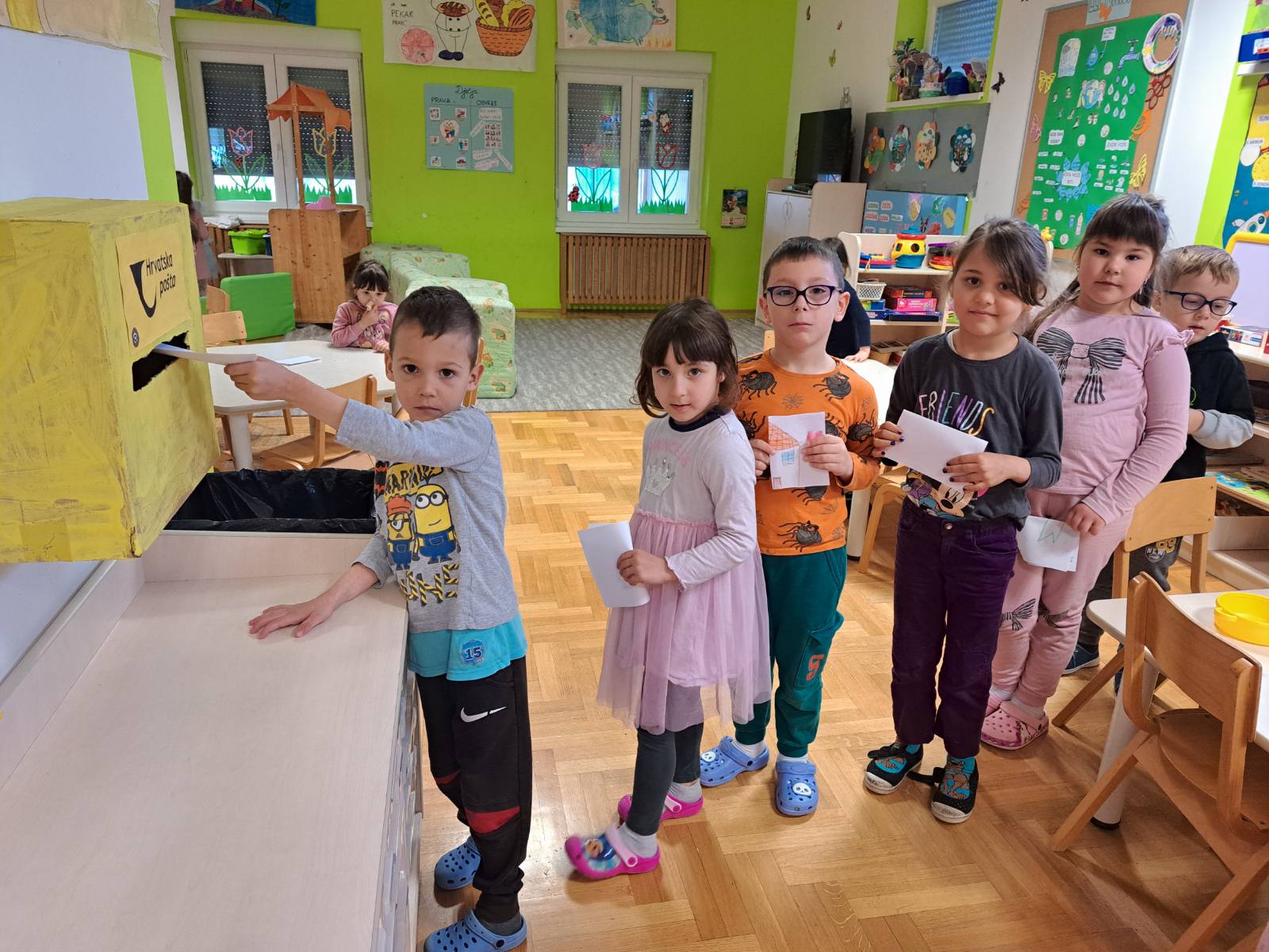 Posljednje zanimanje koje smo nastojali djeci približiti je bilo zanimanje poštar. Percepcija većine djece je da poštar nosi pakete i račune, vozi kombi ili motor. Kroz zanimljive videozapise i fotografije upoznali smo djecu s opisom posla poštara, njegovim izgledom i prijevoznim sredstvima. Naše istraživanje produbili smo brojnim likovnim aktivnostima, igrama ali i šetnjom do lokalne pošte. Da bi se što više “uživjeli” u ulogu poštara, djeca su “slala” jedni drugima poštu, zajedno s odgojiteljicom su izradila jednu veliku razglednicu i svoje poštanske markice, dječaci su lego kockicama izgradili poštu onako kako je oni zamišljaju.