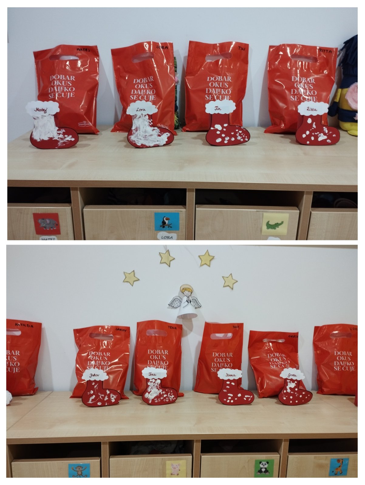 Vrijeme adventa ili došašća je zasigurno jedan od najljepših i najčarobnijih dijela godine. Sve je u znaku darivanja, čarobnih mirisa ali i iščekivanja rođenja malog Isusa. I mi smo krenuli sa pripremama. Uređujemo naš vrtić božićnim dekoracijama, zapalili smo 1.svjećicu na adventskom vjenčiću, za dolazak sv. Nikole smo se marljivo pripremali. Slušali smo i učili pjevati pjesmice “Sveti Niko” i “Ručice nam Niko daj”, promatrali njegovu maketu, izradili čizmice, bojali bojanke, slušali stihove i uživali u igrokazu “U noći svetog Nikole”. Kroz stolno – manipulativne igre djeci se još više nastojalo približiti lik i djelo sv. Nikole. A sv. Nikola je vidio da smo bili dobri i marljivi pa nas je sve iznenadio i razveselio sa svojim poklonima.
