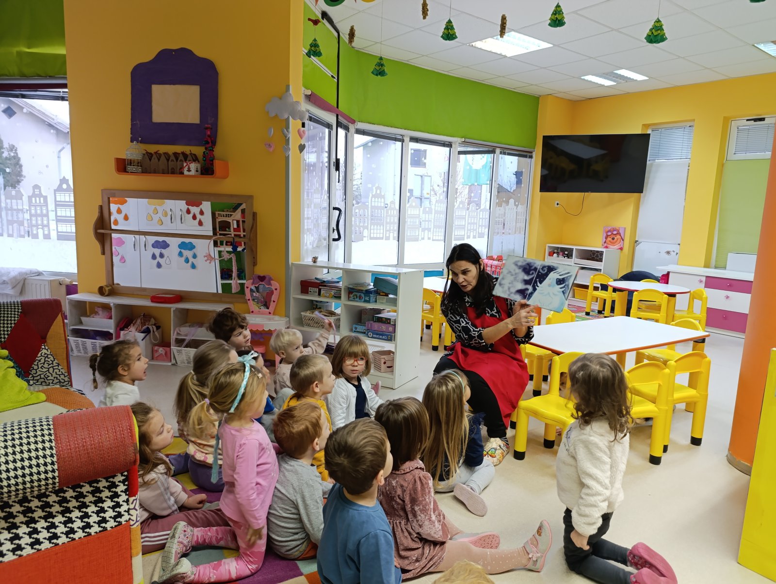 Djeca se jako vesele zimi i prvim snježnim pahuljicama koje su zabijelile naš grad. Iz razgovora smo saznali kako nastaje snijeg. Slušali smo pjesmice „Padaj, padaj snježiću“, „Pahuljice padajte“, „Ide zima“ i „Saonice male Sanje“. Djeca su izrezivali pahuljice iz papira i ljepila ih na plavu podlogu. Svaka pahuljica je bila drugačija. Veliki interes djece je bio za igru sa snijegom. Igru su obogatili različitim PVC predmetima i vozilima. Istraživali smo kakav je snijeg na dodir, ima li mirisa, koje je boje. Djeca su izrađivala snjegović s od snijega, a poslije su bojali snijeg temperama i dobili su šareni snijeg.