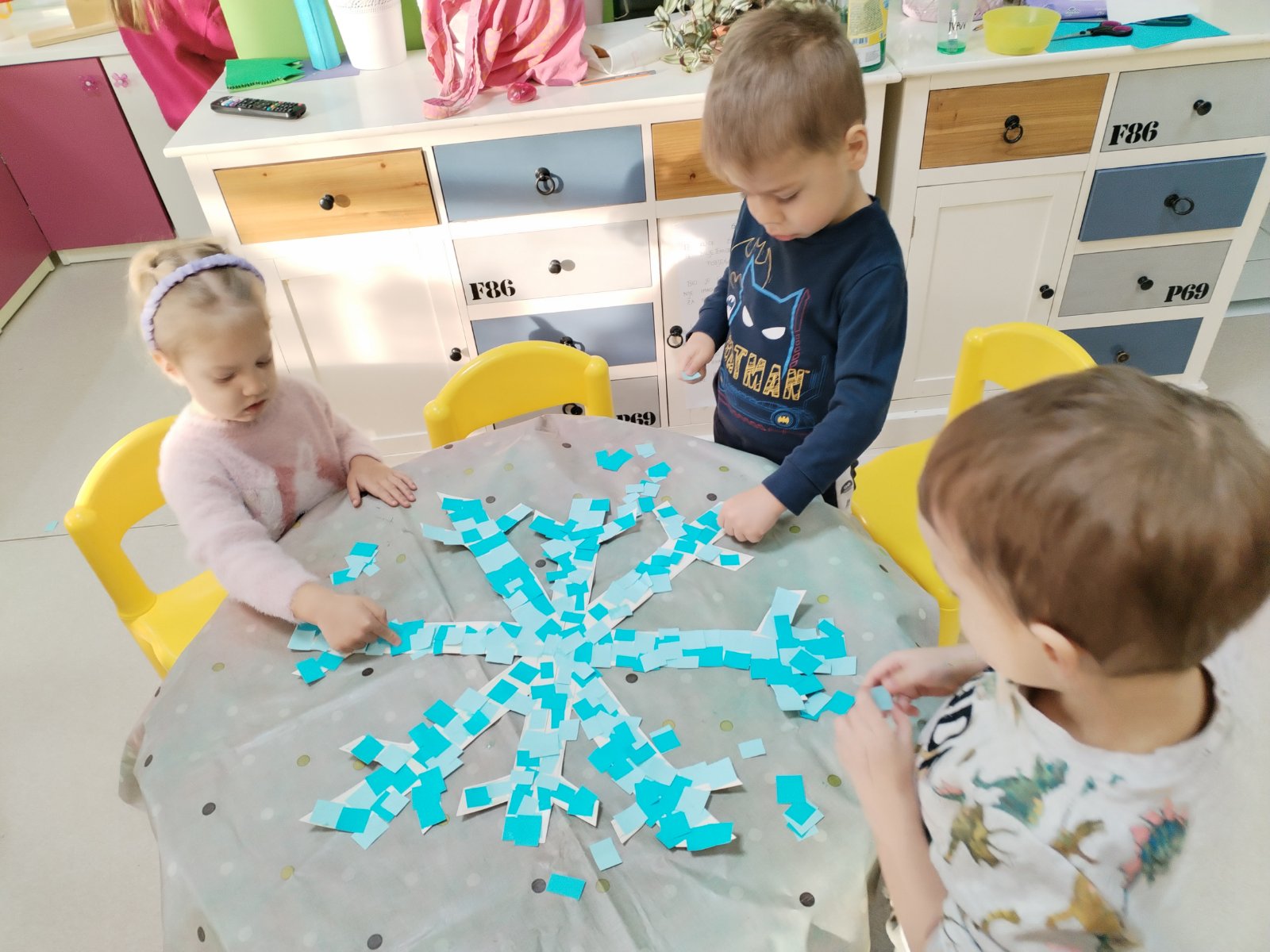 Tako su djeca promatrala snijeg povećalom, gradila snjegoviće i promatrala što se s njim događa na sobnoj temperaturi i na dlanu. Utiskivali su snijeg u kalupe, a od dobivenih blokova gradili razne građevine. Snijeg je ujedno poslužio i kao podloga za slikanje, te su ga bojali temperom. Osim toga djeca su bogatila vokabular pjevajući prigodne pjesmice (Padaj, padaj snježiću, Baka zima, Snješko, slušajući priču Zima u vrtu, te gledajuću scenski prikaz Zeko i snjegović. U likovnoj aktivnosti djeca su u tehnici kolaž radila snjegoviće i pahuljicu, a od umjetnog snijega koji smo izradili od škrobnog brašna i ulja modelirala su snjegoviće. Za razvoj fine motorike i preciznosti djeci su bile ponuđene aktivnosti koje su uključivale rezanje škaricama i didaktički materijal (igra nahrani snjegovića hvataljkom, pika slika pahuljica, poklapalica snjegovići po boji i djeci vrlo zanimljiva igra, kuglana snjegovići od papirnatih čaša). Ipak, od svih ponuđenih aktivnosti i poticaja, najviše veselja i zabave pružio je boravak na snijegu i grudanje. Slike možete pogledati u foto galeriji.